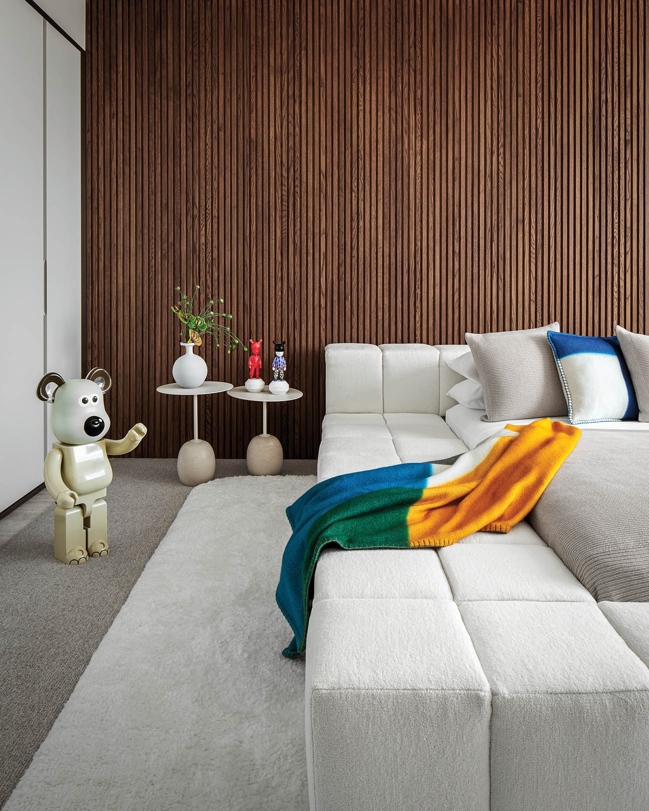 This playful yet sophisticated kidsâ room blends comfort with elevated design. A custom, marshmallow-inspired bed upholstered in Dedar fabric anchors the space, inviting both rest and imagination. Beneath it, a pair of Double Layer Art + Loom âfluffyâ rugs add texture, perfectly complementing the rich walnut wall by Casa Metier that lends a refined, organic backdrop. Pops of color from Hermès throws and pillows introduce a touch of whimsy, while curated dĂŠcor tie the room together with an effortlessly modern aesthetic.