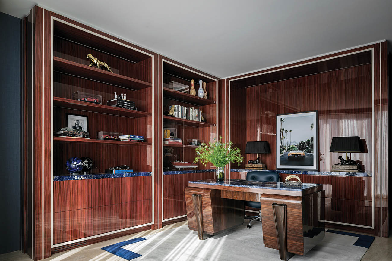 Blue hue accents of Lapis Lazuli stone, a navy leather Eames executive chair, and an Art + Loom rug give a nod to the marine environment and the white striping layered into the millwork complete the luxury yacht vibe.