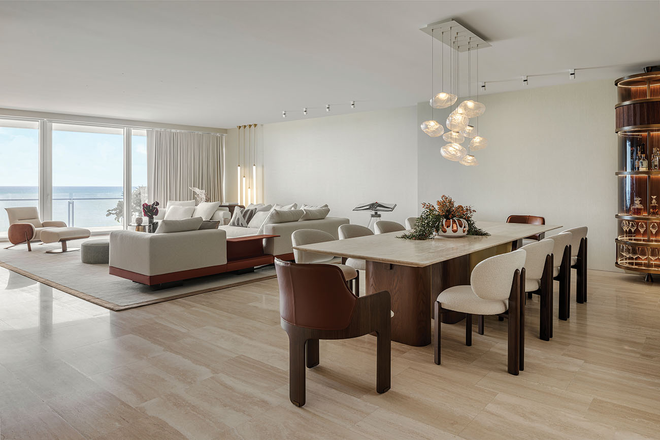 The dining area is an elegant balance of artistry and restraint, designed to capture both the ocean view and a sense of effortless sophistication. A floating, airy âjellyfishâ Bocci fixture drifts above the custom Casa Dio dining tableâcrafted from travertine with metal inlay and woodâcreating a sculptural focal point that mirrors the fluidity of the sea beyond. The custom ceiling- and floor-mounted bar unit adds architectural intrigue and functionality, blending seamlessly into the open-concept layout. Enne dining chairs introduce soft curves and tailored comfort, completing a space that feels both luxurious and intimately livable.