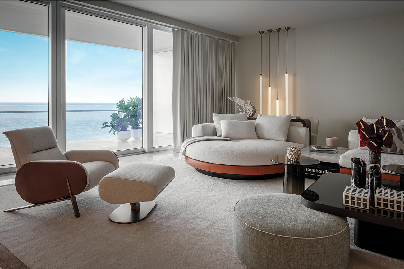 When this energetic coupleâwho share a passion for cars, boating, flying, and James Bondâtold Genevieve Love Lake, Principal, and Emma Frayssignes, Senior Designer of Love Lake Studio they were moving from their existing two bedroom Surf Club condo to a four-bedroom, the designers immediately knew the design had to reflect their combined adventurous spirit, but also play on their individuality . Deeply appreciative of the iconic Richard Meierâdesigned building, which opened in 2017, they wanted a home that respected the architectural language of the space while feeling uniquely their own.