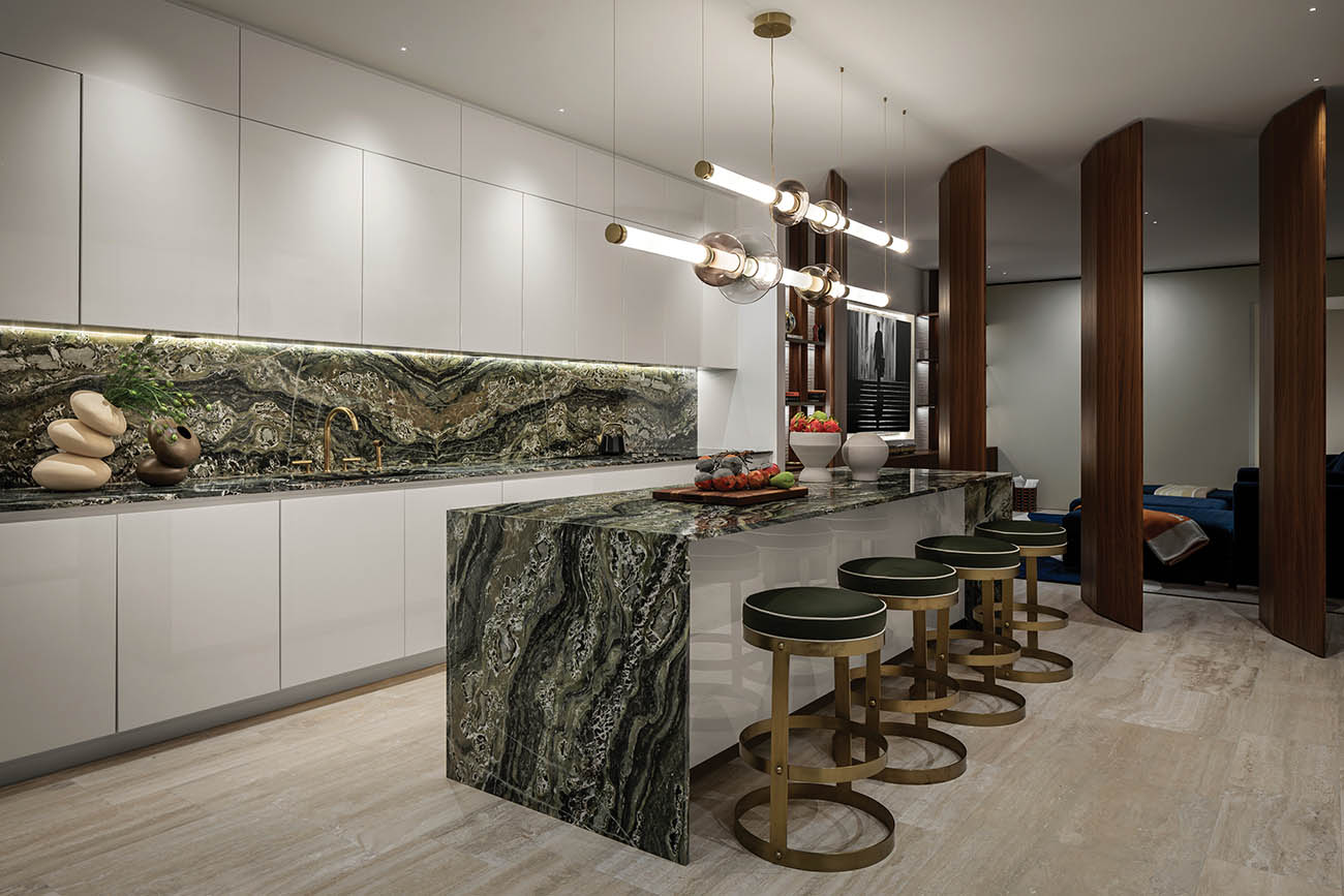 âTo balance the clean modern lines, we layered in warm wood tones and rich textiles, bringing softness and intimacy to the open-plan layout,â the designers share. Bold, expressive stone became the anchor for the entire conceptâselected during a hands-on visit to the slab yard, which gave the clients a tactile, emotional connection to their selections.