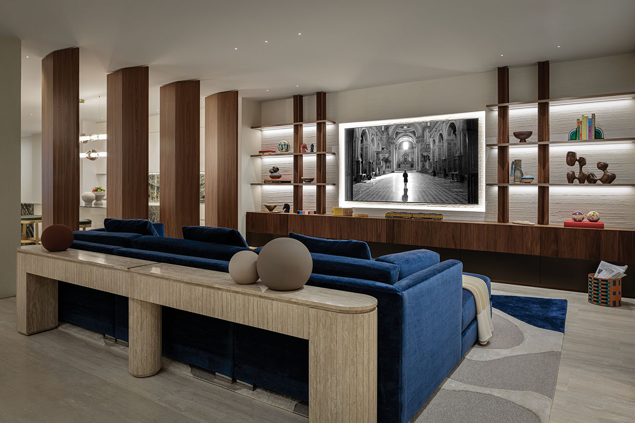 Echoing the theme of flight, millwork columns carry through the living and media areas, reinterpreted at a smaller scale to appear as if they pierce through bronze metal shelving. The media room itself features a rich Donghia sectional in Sapphire mohair, a custom travertine console, and an Art + Loom rug, creating a grounded yet luxurious atmosphere ideal for both relaxation and entertaining.