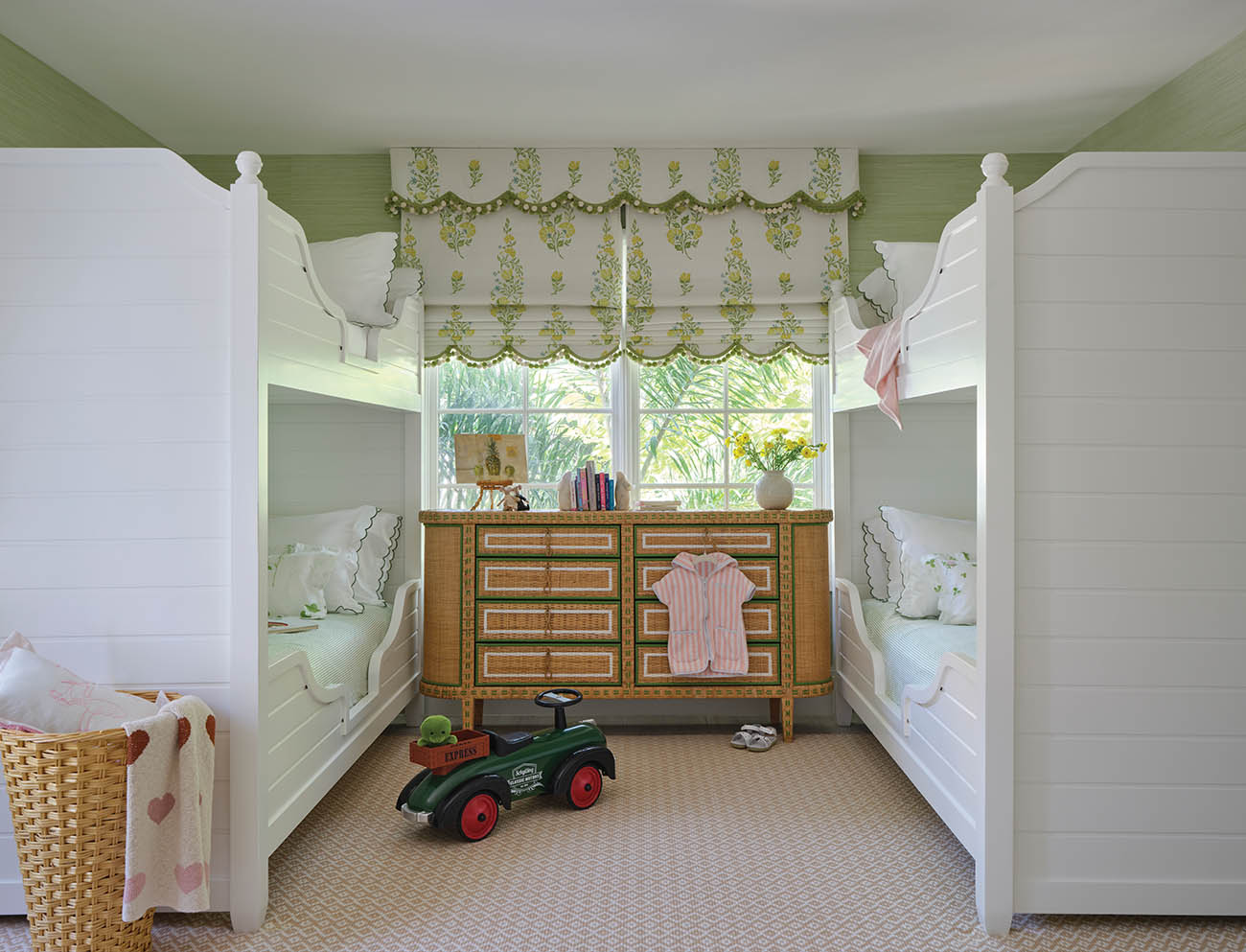 “Kids rooms function more like guest rooms in vacation homes than their everyday bedrooms at home, which typically need places to do homework, bookcases, good storage, and so forth,” says Bowman.
