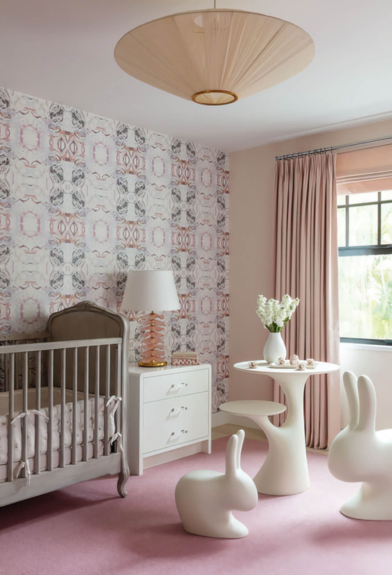 Lisa Erdmann says she typically starts the design of a child’s bedroom with a wallpaper and draperies that will offer a seamless transition from infancy to toddlerhood and grade school. She says stripes are a go-to for designing a boy’s bedroom and an all-over pattern for girls’ spaces, as they are versatile for changes in bedding, artwork, and accessories over time.