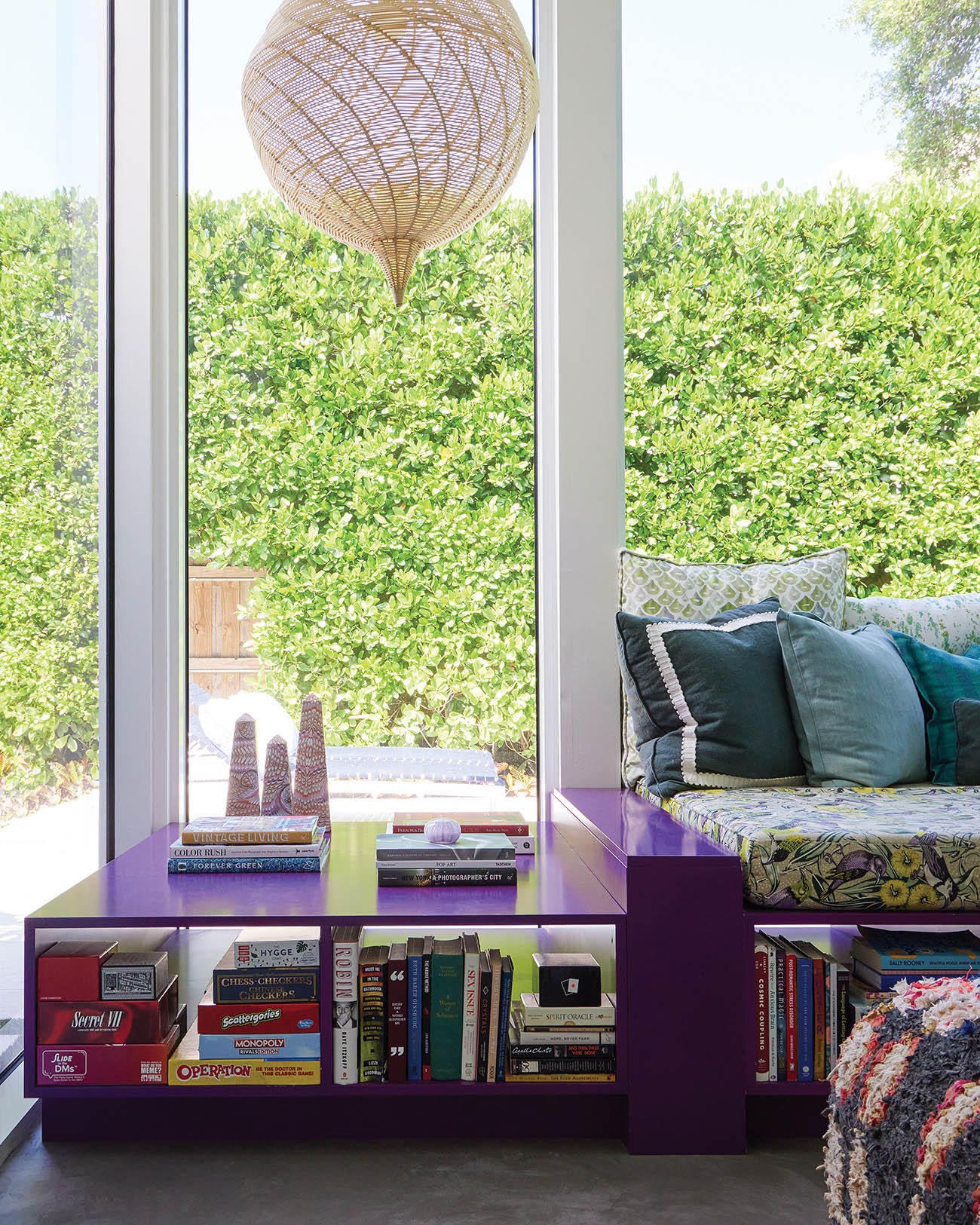 One of the home’s greatest decorating challenges was the sun room, which is a long, narrow space that features floor-to-ceiling windows and a fireplace. Grauer and Trepte ended up creating a custom piece that offers storage and seating from one end of the room to the other (in an electric purple, no less) to solve the issue of a pesky layout while ensuring it is inviting and purposeful for occasions of all kinds. It offers clever hidden storage for chargers, remotes, and other less aesthetically pleasing items in the “arms”’ of the bench. Though it posed some headaches, this space became one of the most special rooms to the pair, featuring a puzzle table (both are major puzzle lovers), favorite books, and collected knick-knacks that offer a warm welcome to all who enter.