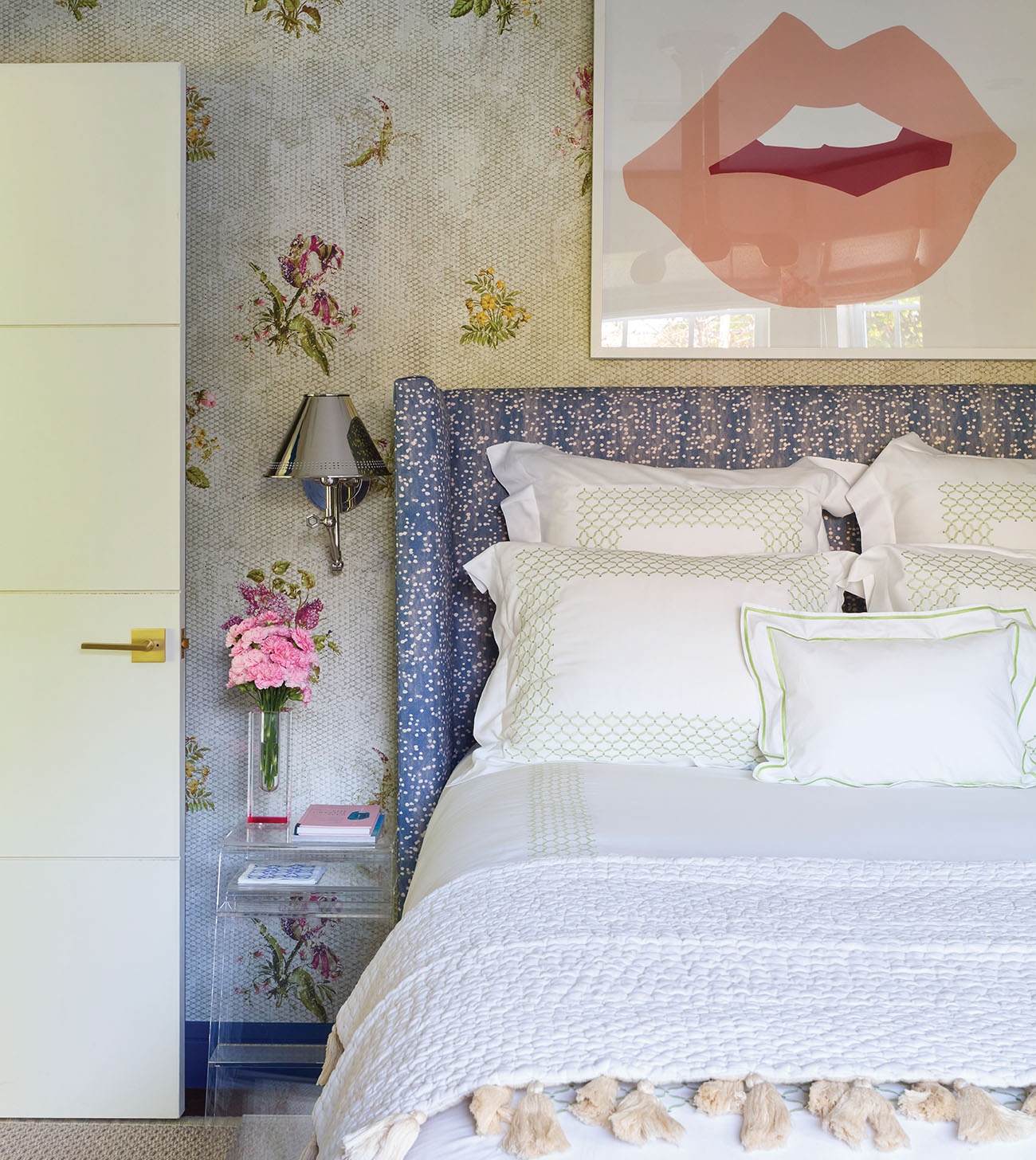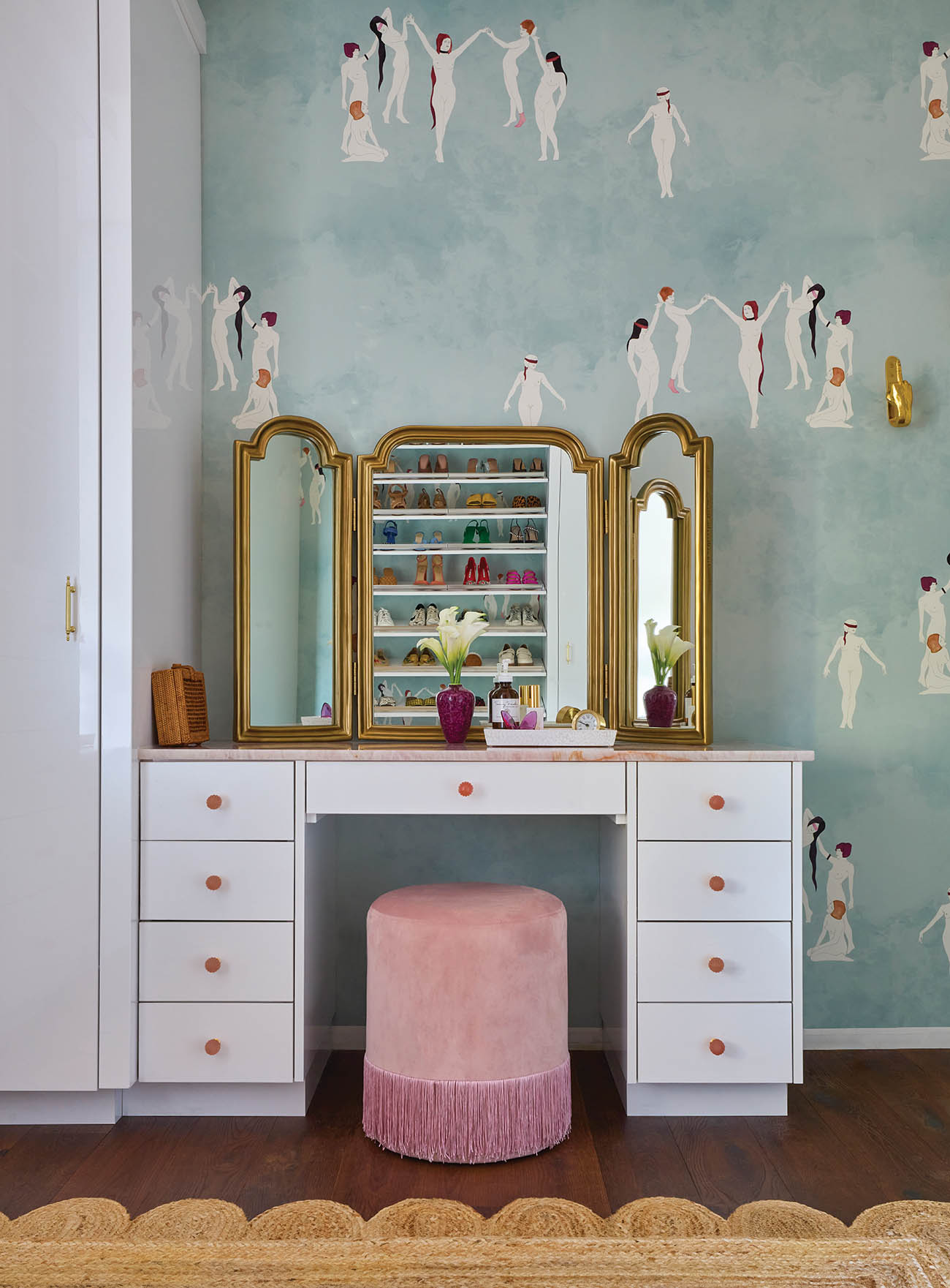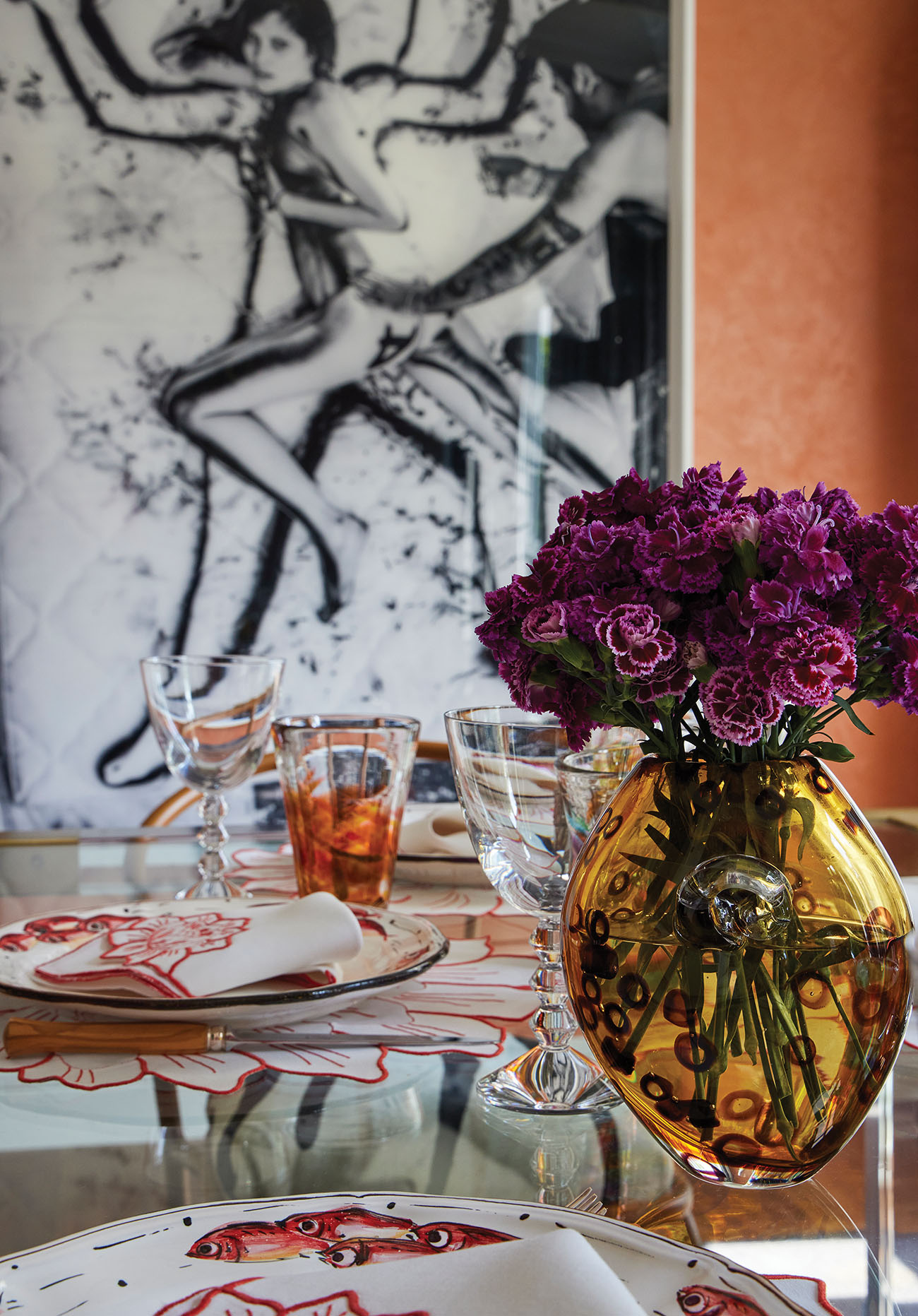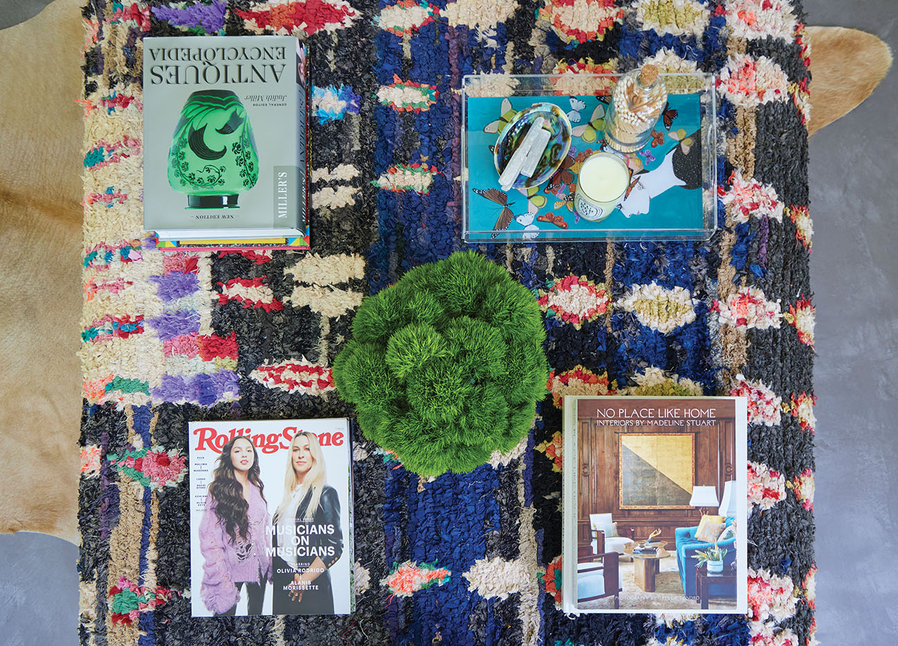 Though the home certainly colors outside of the classic Palm Beach design lines in a fresh, funky way, there are plenty of design elements that offer nods to the local aesthetic to make it feel contextual with a youthful twist. The paint selections, such as the verdant green on the living room bar and the peachy pink in the dining room, offer a spin on this classic color pairing, while there are plenty of locally sourced antiques (Delray’s Dolphin & Flamingo was a top sourcing spot), natural fiber dining chairs, midcentury silhouettes, and botanical motifs that seem to welcome a new era of Palm Beach decorating without eschewing tradition entirely.