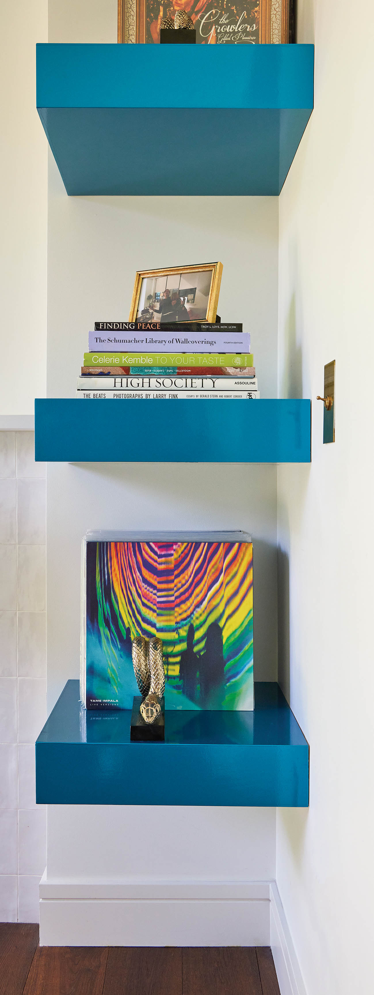 The duo was inspired by Dekay Grauer’s love of midcentury style, rock and roll, pattern play, and a need for functionality, as the 1,800 square foot home needed to wear a lot of hats. And considering they were their own clients, the pair embraced the freedom and let their imaginations run wild, taking risks with color and pattern while also experimenting with storage space and how they could maximize functionality. Plus, they were able to employ a chic hidden door behind the bar (a childhood dream of Nina’s) that led to her primary bedroom suite.