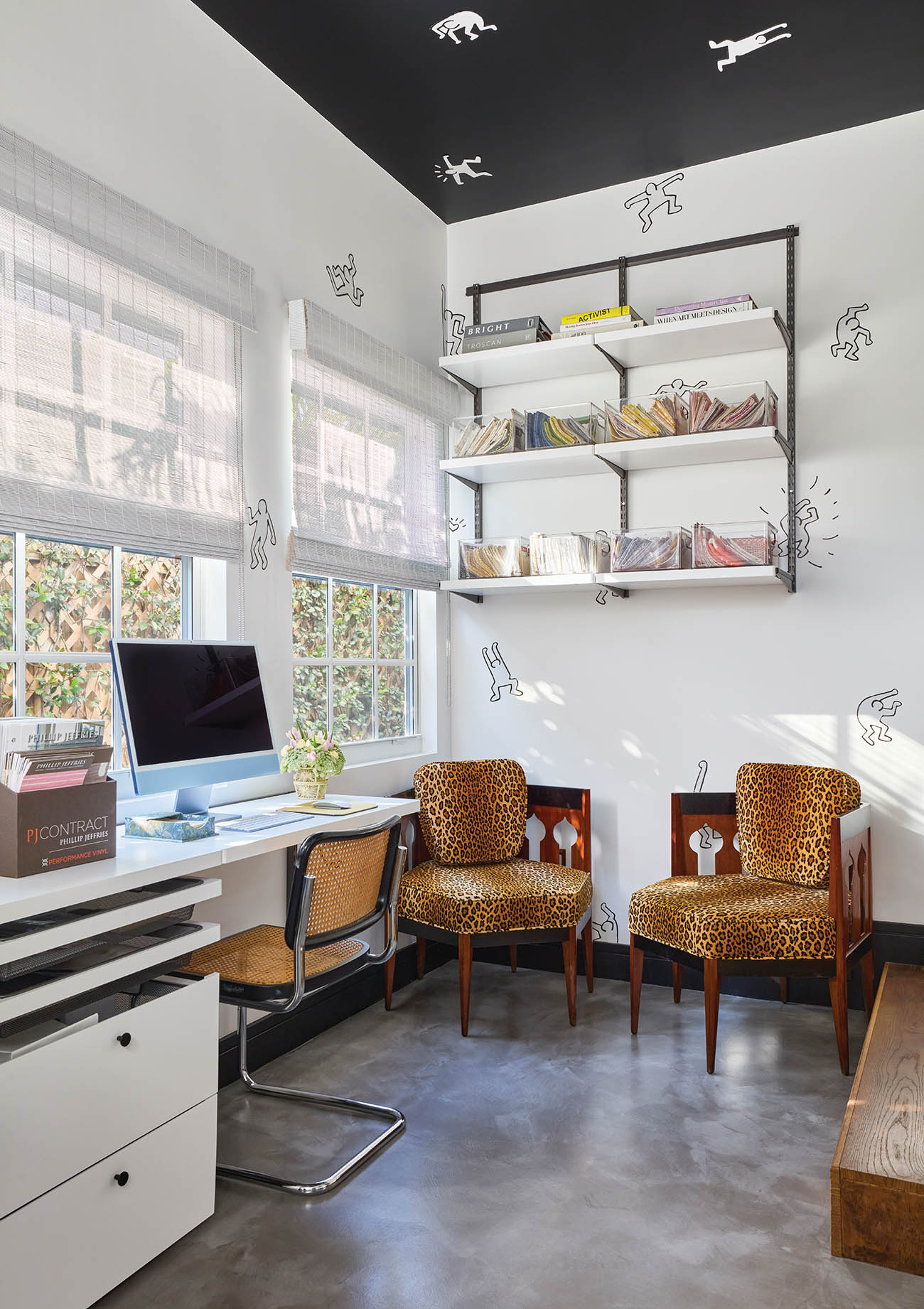 The home’s light fixtures, in particular, became defining elements of each space, as nearly all were statement-making vintage finds, from the chic table lamps on the beloved mirrored credenza to the various metallic hanging fixtures that add a layer of textural elegance. The leopard print chairs used in the office also became a starting point for this all-important space for boosting creativity and meeting with clients. However, considering this home is part- design laboratory for the firm, Grauer admits it’s always a work in progress and serves as a safe space for the duo’s ideas to run wild.