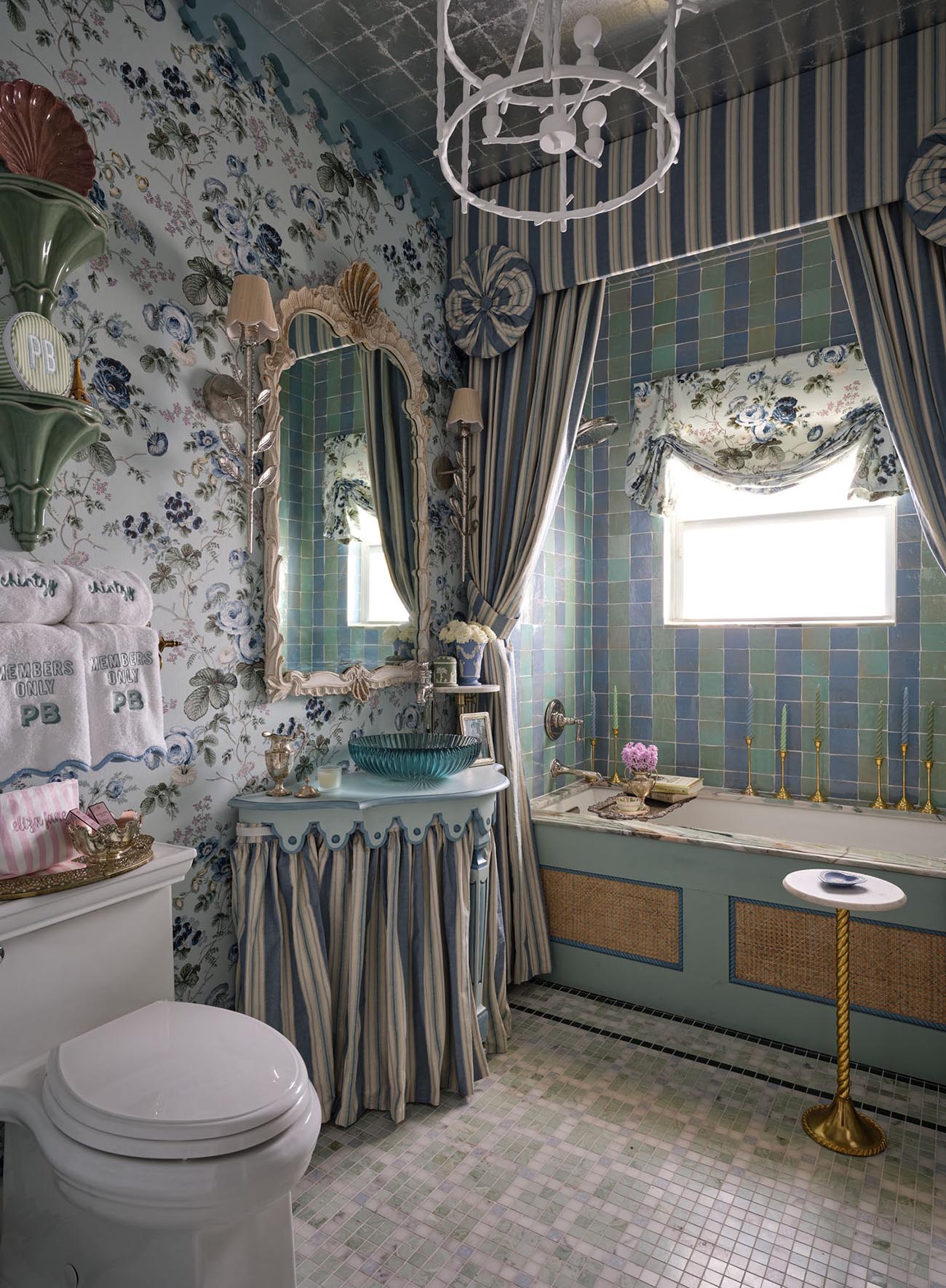Chintz By The Sea is classic Palm Beach glamour with some cheeky nods to current pop culture. Nationally recognized for her elegant bathroom designs, Tori Alexander of Alexander Interiors incorporates her signature aesthetic with a timeless floral wallpaper by Schumacher in soft tones of blue, aqua, and violet, layered with Metal Leaf Square in the silver colorway by York Wallcoverings, which adds a subtle shimmer and reflective depth to the space. The color palette continues into the shower walls, with vibrant azure and aqua tile from Artistic Tile. Special attention was poured into the one-of-a-kind sink vanity, which is a culmination of creativity and resourcefulness. A vintage wood console, hand-painted by Tori, is adorned with a silk stripe skirt from Cowtan & Tout. The crown jewel is the “sea glass” vessel sink provided by Kohler. A stately seashell vintage mirror, tall enough for any socialite in the highest of heels to admire herself, was sourced from Tori’s favorite Palm Beach atelier, James & Jeffrey Antiques. Whimsical light fixtures from Made Goods bring in elements of nature and perfectly finish the space. Traces of Tori’s playful nature are sprinkled throughout. We hope you will take a mirror glam shot with Suebelle’s hairspray and use the telephone to “tell us something chintzy.” If you need a local number, we’ve left Gayle’s rolodex for your convenience!