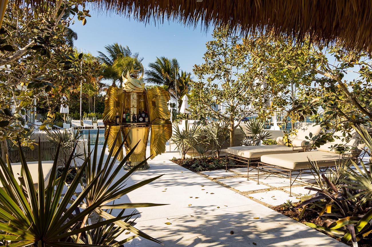 Paradiso – Metals dominate in the bronze and steel of the Cocktail Garden from furnishings to plantings. The central Seraphim Bar by Belt Metal takes inspiration from Les Lalannes with complementary contemporary steel Atelier Artizan lounge furnishings with fabrics by Perennials and tabletop in Verde Ligure marble by Primestones. The monumental “FLO” by David Harber contains the axial view to the water with a bronze keyhole into the sublime.