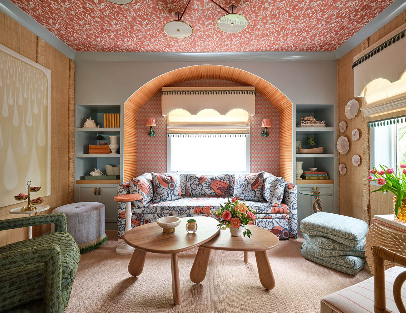 New Jersey–based Interior Designer Colleen Rosar, principal of Colleen Rosar Design, along with her team, transformed one of the bungalow’s bedrooms into a flexible sitting room designed for the moment you return home and decide to stay. Inspired by travel and a collected way of living, the space adapts naturally from lounging and entertaining to hosting overnight guests. A Gramercy Daybed by Burton James, upholstered in a stunning fruity floral, anchors the room, equally inviting for an afternoon hangout or a cozy night in, while a Sherrill Furniture round ottoman in a silky blue Lee Jofa Modern fabric in collaboration with Kelly Wearstler adds softness and versatility. Warmth comes from the Amara Dark Stained Poplar Dresser by Made Goods, cleverly reimagined as both dresser and bar and topped with a beautiful white Calacatta marble countertop from Primestones, set against a playful backdrop of Ground Works Lee Jofa’s Mineral Paper in Algae. Custom-designed glass shelving adds both function and charm, while refined Corston light switches provide thoughtful, architectural detailing throughout the space. No surface was left untouched, with accessories from Made Goods and Pigeon & Poodle layered throughout, and Blue Pheasant barware completing the perfect spot to mix a drink. Seating is thoughtfully layered with a Tegal Chair by Currey & Company, a natural rattan accent with intricate detailing, alongside a vintage chair reimagined in a two-tone Lee Jofa fabric in collaboration with Kelly Wearstler. The sculptural Peacock Side Table by Currey & Company adds a striking decorative moment. Underfoot, the Desta Rug in Honey by Stark grounds the room, while Riviere wallcovering by Paolo Moschino, available at Lee Jofa, draws the eye upward and lets the imagination wander. Window treatments by The Shade Store, finished in a soft creamy Kravet fabric and accented with an unexpected jade trim from Samuel & Sons, add tailored elegance. Pooky Lighting keeps the room bright and inviting with a charming table lamp and art lights that highlight the walls, and Benjamin Moore’s soft yet impactful paint ties everything together, beautifully emphasizing the built-in details.