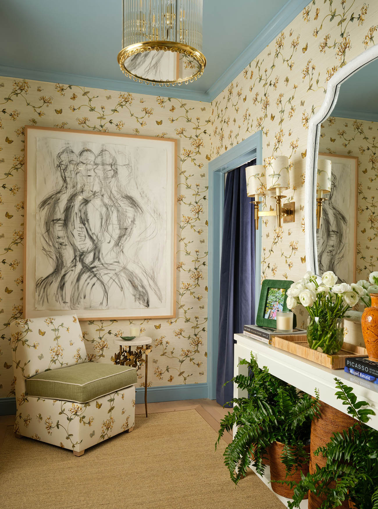 Step into this gracious passageway, where transitional elegance transforms a simple corridor into a quietly enchanting moment within the home. Designed to be both functional and transportive, the space unfolds as a refined vignette—one that rewards lingering glances and thoughtful detail. The walls are enveloped in a delicate floral wallpaper from Colefax and Fowler, its soft embroidery lending romance and movement while setting a serene, layered backdrop. Pale blue trim crisply frames the architecture, offering a tailored contrast that feels both fresh and timeless. Underfoot, a tailored runner stretches the length of the hall, grounding the space with subtle texture while drawing the eye forward toward a mirror from Meg Brass Designs that anchors the far wall. Framed in a dark, sculptural surround, the mirror reflects light and depth, visually extending the room and adding architectural intrigue. Overhead, a refined pendant fixture by Vaughan Lighting casts a warm, ambient glow, infusing the corridor with understated glamour. One wall is softened by floor-to-ceiling drapery from Jane Churchill fabricated by The Shade Store, introducing an elegant sweep of fabric that enhances the room’s sense of intimacy while concealing transitions beyond. Opposite, a slender console table by Casita Furniture serves as a curated moment of display—layered with sculptural blue ceramic vessels and a tray from Meg Braff, and thoughtfully stacked books that bring a collected, lived-in sensibility. Above, a striking piece sourced through Acquavella Galleries adds drama and movement, its expressive lines balanced by classic brass sconces from Vaughan, which bathe the wall in a flattering, golden light. Together, these elements elevate the hallway beyond mere circulation, transforming it into a polished interlude—one that bridges rooms with grace and intention. European Oak flooring in the rich Nogalon finish by STORIA Flooring brings warmth and depth to the passageway. This is a space designed not simply to be passed through, but to be experienced: a quiet pause, a visual breath, and a testament to the power of detail-driven design. The corridor stands as a reminder that even the most transitional spaces deserve thoughtful attention—where beauty, function, and craftsmanship meet in perfect harmony.