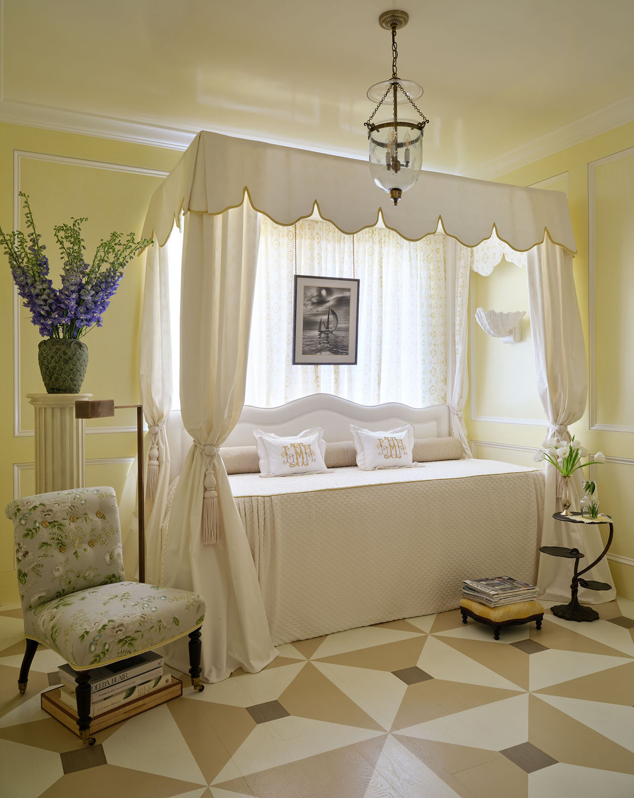 The perfect ladies’ escape, Lucinda’s Lounge is an ode to Kate’s mother—her forever muse and greatest design inspiration. This intimate sanctuary, made possible by O’Neill-Construction, is enveloped in the happiest tonal yellow stripes and grounded by boldly painted floors, both by our fabulous decorative painter, Shelly Decorative Painting. Coston electrical plates add the perfect jewelry to the walls. A bell jar lantern by A. Sanoma illuminates the room. The room, decorated entirely in Schumacher fabric, features a whimsical canopied daybed crafted by AC Designs and upholstered in solid cotton white chintz and gingham silk. Samuel and Sons tie backs elegantly accent the canopy panels. The bedding—custom bolsters and bedspread, along with a pair of monogrammed boudoir pillows by Leontine Linens—creates the perfect invitation for a midday nap. Not to be missed is the deco gesso shell sconce by RT Facts, which casts the most enchanting mood lighting within the bed alcove. Step onto a Tuareg mat from Rug and Kilim and across the room to a divine vanity and desk nook, wrapped in custom basketweave lattice by Fuller Architectural Panels and illuminated with Urban Electric sconces. Atop the antique desk sits a striking slab of onyx marble sourced from ARCA Marble, while accessories from Pigeon and Poodle and Currey & Company complete the vignette with polish and charm. Tucked sweetly into the corner is a slipper chair upholstered in a beloved Schumacher chintz, finished with Samuel and Sons tufting, and surrounded by a Bunny Williams pedestal and occasional table. Black and white sailing prints by Rosenfeld, framed by Bedford Framing, complete the space—an elegant nod to the femininity and romance of the racing yacht.