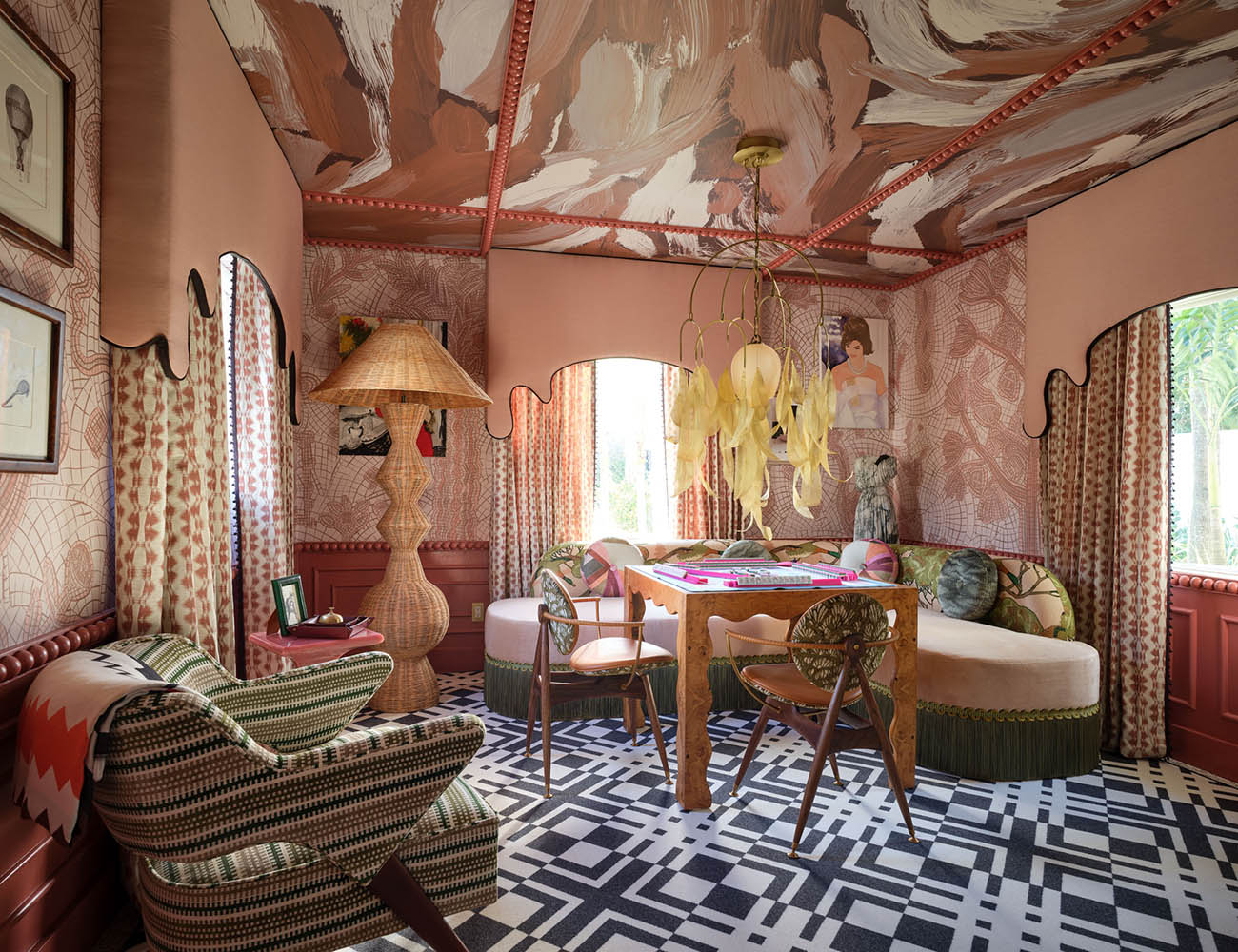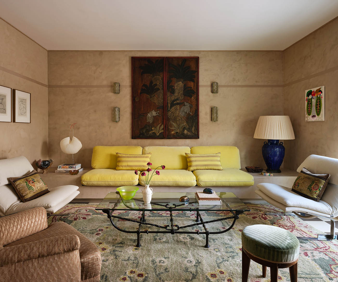 The Citron Salon is a refined respite from the Florida sunshine. It’s a place to unwind, entertain, or quietly catch up on correspondence. Equal parts elegant and inviting, the room offers a cocoon of warmth and personality. Upon entering the vestibule, guests are welcomed by a decorative panel created specifically for Kips Bay by artist Sandra Constantine. Her brushstrokes and layered palette set the tone for the experience ahead, introducing movement and color. The artwork acts as both a threshold and a peek at what is to come, drawing the eye forward and signaling the layered narrative that unfolds throughout the space. The checkerboard flooring underfoot harkens back to the 1950s—a heyday of Palm Beach—adding a playful note of nostalgia and graphic energy. Anchoring the seating area is an antique Savonnerie Arts & Crafts carpet from Rug & Kilim, whose rich coloration and pattern soften the geometry of the floor while lending a cozy, lived-in elegance. Together, these elements strike a balance between vibrancy and comfort, honoring Palm Beach’s storied past through a modern lens. The walls are swathed in a burnished lime plaster from Ressource Americas in a warm taupe hue. Its waxed finish captures and reflects light throughout the day, creating a luminous backdrop that shifts with the sun. A subtle stripe of Samuel & Sons grosgrain ribbon accents the plaster, inspired by a similar trim application used at the Isabella Stewart Gardner Museum of Art. Against this neutral foil sits a custom built-in sofa upholstered in plush citron velvet—an unmistakable focal point that invites guests to sit, linger, and relax. Sheer drapery from Pierre Frey rests upon the door, gently moving with the coastal breeze and reinforcing the room’s serene, indoor-outdoor sensibility, and is finished with Samuel & Sons Abrille Juste Tassel Tiebacks, adding a tailored yet decorative finishing touch. A thoughtfully curated mix of vintage furnishings sourced from Avery & Dash populates the space; 1970s Saporiti slipper chairs provide sculptural comfort, while a Giacometti cocktail table grounds the seating area with organic form. A mid-century modern writing desk offers a quiet moment of function, perfect for penning notes or working on one’s next novel. Murano wall sconces cast a warm, flattering glow, complemented by a whimsical sculptural lamp by Ingo Maurer. Bronze hardware by Corston rounds out the room’s materiality, an architectural detail that elevates the understated luxury of the space. Whether sipping Grasshoppers with friends debating the latest episode of Palm Royale, or enjoying an afternoon of reading and reflection, the Citron Salon is designed to do it all. In a destination known for its sun-drenched glamour, this room reminds us that sometimes the greatest luxury lies in retreat.