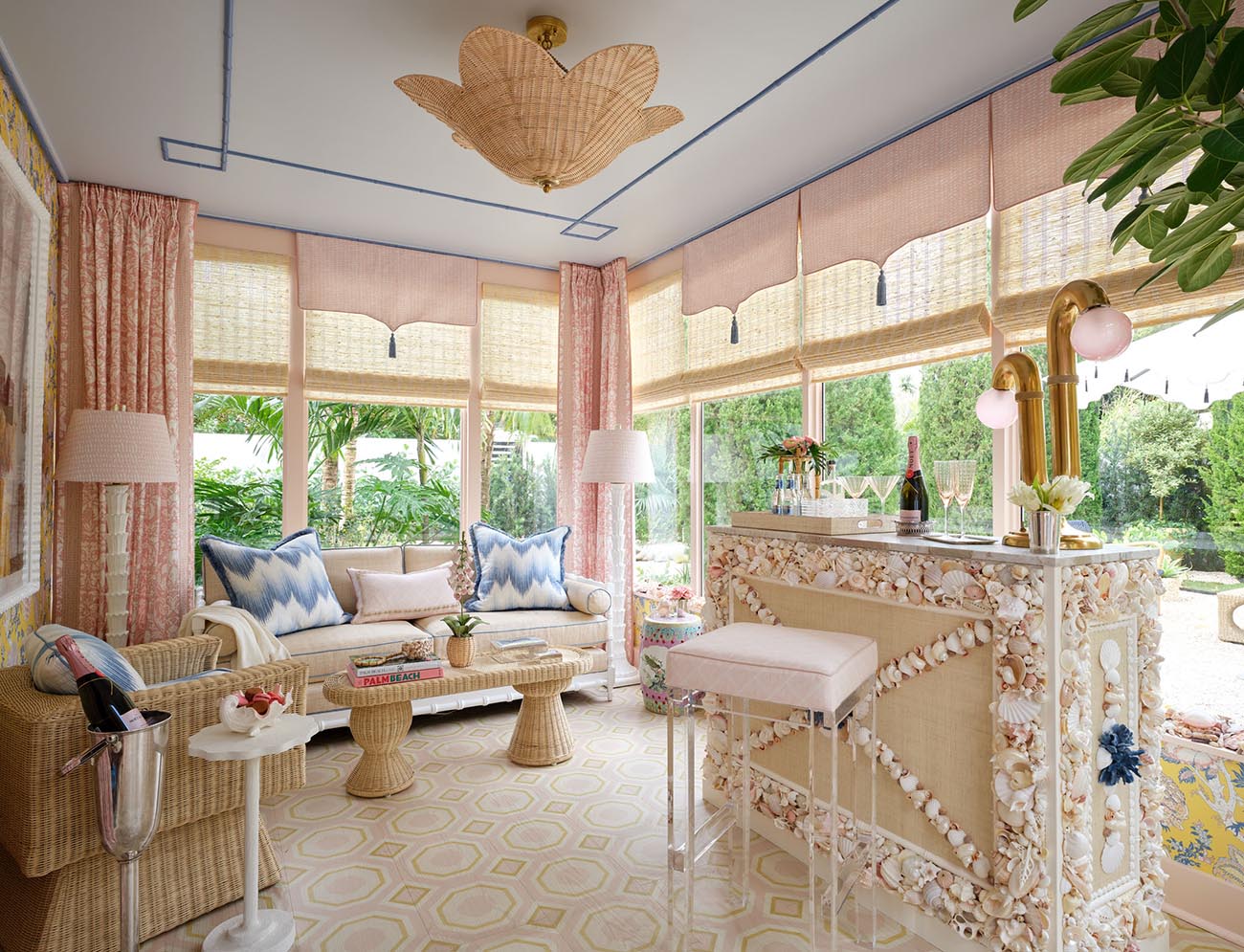 Once a sunroom, The Lewis Gallo Design Group’s Champagne Conservatory has been reimagined as the home’s most inviting pause — a cheerful, intimate spot designed for popping corks, swapping stories, and lingering a little longer than planned. Inspired by the playful elegance of Old Palm Beach, the room captures a spirit of ease and celebration, equally suited to afternoon light or an evening glow. A breezy palette of blush pink, buttery yellow, and sky blue sets the tone, layered with rich pattern and texture through wallpapers, fabrics, and furnishings sourced from Casa Branca Atelier. Beneath it all, flooring by Mirth Studio grounds the space, offering a tactile counterpoint to the softness above, and Benjamin Moore’s Pink Moiré creates a soft, enveloping glow. At the heart of the room is a custom sculptural shell bar, meticulously crafted by All Seasons Accessories — the anchor and defining element of the Champagne Conservatory. Both functional and artful, the bar establishes the room’s celebratory spirit and coastal character, serving as a natural gathering point for conversation and champagne alike. Accents of natural stone — Primestone’s Dolce Australe Quartzite, expertly fabricated by Oceana Designs — introduce a subtle sense of permanence, balanced by shell details and Ramsey Bar Stools from Made Goods that nod to Palm Beach’s coastal legacy. A chippendale sofa from Palm Beach Regency invites guests to settle in, while Samuel & Sons French Grosgrain Ribbon, piping, and Aristotle Greek Key trim lend a note of polish to the room’s relaxed sensibility. Lighting plays a starring role, with statement fixtures from Ro Sham Beaux casting a flattering glow, complemented by standing lamps from Devonshire that enhance the room’s intimate, evening-ready atmosphere. Art selections by Nick Mele and Amee Calloway inject personality and a slightly mischievous energy, recalling impromptu gatherings and moments of unexpected fun. Bright, breezy, and always ready for a toast, the Champagne Conservatory is a celebration of Palm Beach living at its most joyful — a room meant to be used, enjoyed, and remembered.