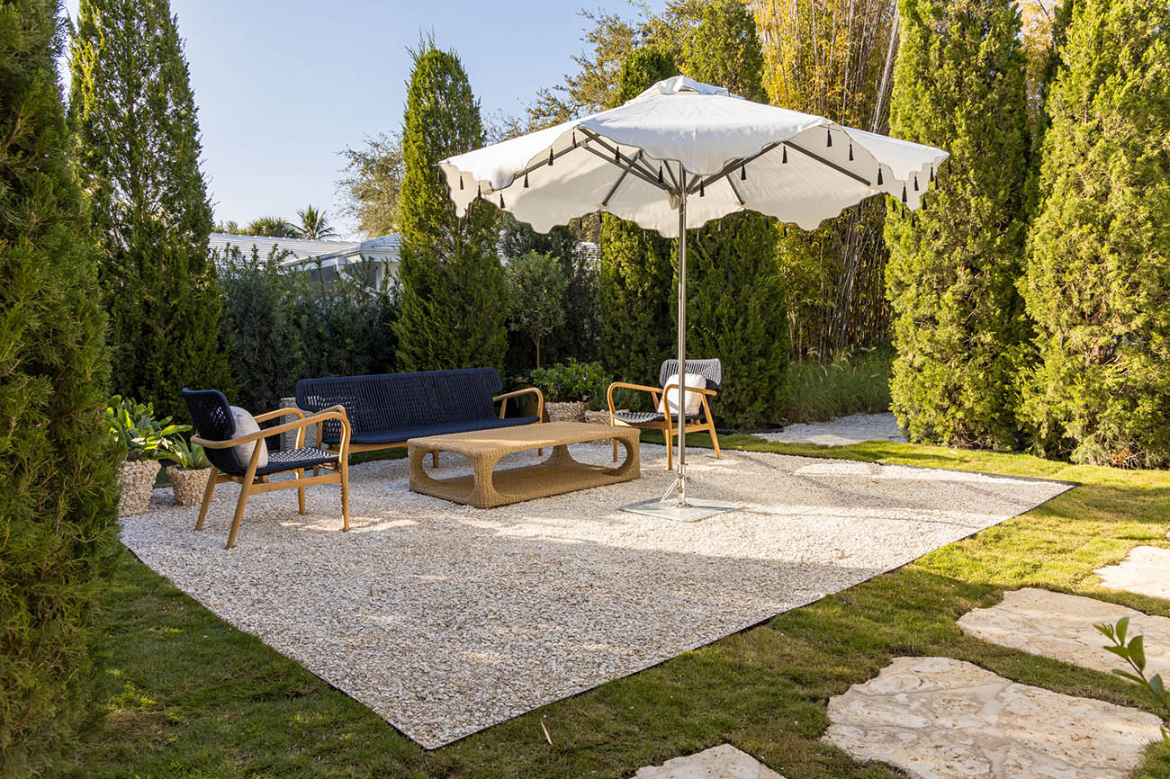 Step into the Florida Garden Rooms, a series of curated outdoor spaces designed to be experienced like the rooms of a home. Each area has its own identity, offering a unique perspective from both inside and outside the house. The design begins with a butterfly garden filled with Florida native plants chosen to thrive in the local climate while providing essential habitats for birds, pollinators, and butterflies. Organic paths wind through vibrant blooms, inviting guests to explore and discover moments of connection with nature. In the formal garden room, southern red cedars rise as sculpted columns, adding symmetry and a sense of tailored elegance that anchors the space. Nearby, a sunbathing room emerges, defined by soft, swaying native grasses and furnished with the Garrison Sofa and Lounge Chairs from Made Goods, welcoming visitors to pause and relax. The outdoor dining area is anchored by the Hadley Dining Table and Felix Dining Chairs from Made Goods, creating an inviting setting for open-air gatherings. Natural stone materials from Florida quarries, including oolite and coral, are incorporated throughout to create a grounded, authentic feeling. An outdoor kitchen island created in collaboration with Good Deals Appliances | Royal Green, featuring Alfresco Grills and constructed by American Outdoor Cabinets, supports effortless entertaining and reinforces the garden’s role as an extension of the home. Washed shells scattered thoughtfully across the spaces tie the garden together, reflecting the effortless harmony of Florida’s landscapes. Every element is chosen for both beauty and sustainability, creating cohesive outdoor rooms that capture the essence of the Florida lifestyle: vibrant, relaxed, and intimately connected to the environment. The design encourages exploration from inside the home as well, framing views and drawing the eye outward to the garden’s distinctive spaces.