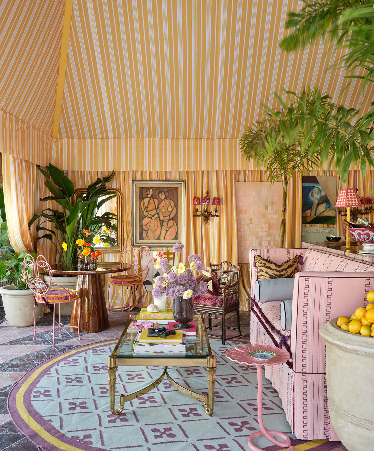 Inspired by a Slim Aarons poolside photograph and the glamorous cabanas of 1960s Palm Beach, the Tiki Tent is our take on a space designed for entertaining. A classic cabana stripe by Schumacher sets the foundation, layered with warm sunset color, daring stone, and bold pattern to give the room its personality and character. An oversized bar anchors the tent as the social heart of the space, designed as a natural gathering point that invites guests to pull up a stool, linger, and stay awhile. The stone is intentionally bold, a cosmopolitan marble that catches the light and brings instant presence to the tent. Patterned lamps, drapery that frames the views, and vintage chandeliers add a touch of drama even in full daylight, giving the space a collected rather than styled feel. Beyond the bar, intimate seating vignettes are tucked along the perimeter, offering quieter moments for conversation, slipping away for a minute, or watching the party without being at the center of it. The flooring is a graphic marble tile that delivers a playful punch and reinforces the cabana’s confident personality. And because no great cabana is complete without a sense of history, the walls are treated like a gallery. Art from different periods and styles is layered intentionally, much like a well worn Palm Beach home that has evolved over time. Twentieth century Italian sconces provide the finishing touch, tying everything together into a space that feels tailored, vibrant, and a little bit funky, with an effortless glamour that makes you want to stay and enjoy yourself. Items & materials graciously supplied by: Artistic Tile, Benjamin Moore, Calia Stone, Cathy Taylor, Daisy Jones, Dead Artist Gallery, Elegant Earth, English Village Lane, Good Deals Appliances I Royal Green (featuring Alfresco), Hannah P. Morris, Joe Turner, Kohler Co., Kristin Blakeney, Laura Deems, Laurel Dawn, Lillian August (a Sherrill Furniture brand), Made Goods, Next Level AVL, Pooky Lighting, Prairie Interiors Inc, Rebecca Jack, Reflectel, Good Deal Appliances | Royal Green, Samuel & Sons, Schumacher, SK Isbell Art, Teil Duncan Art, & The Shade Store.