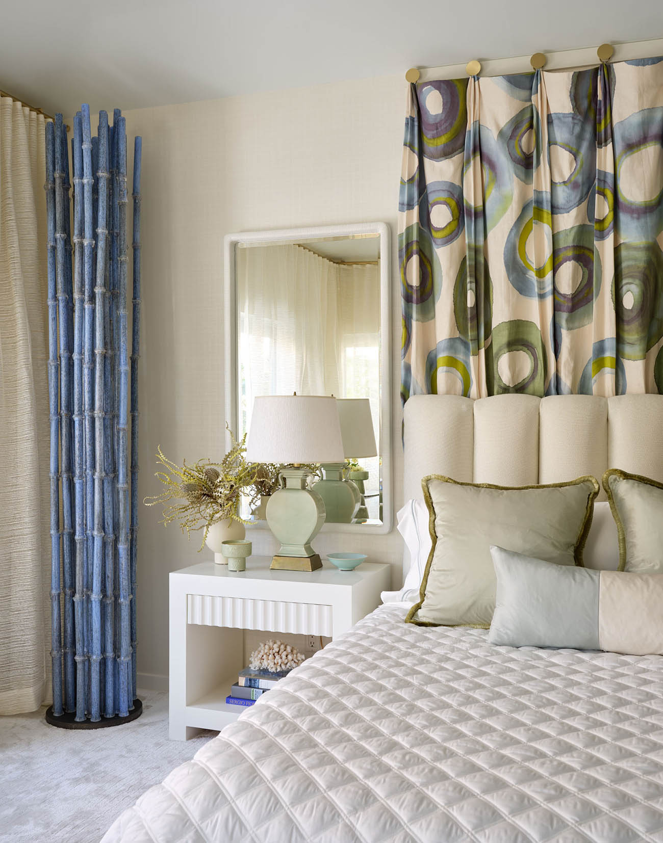 Welcome to the Primary Sanctuary, where peaceful glamour envelops the masters of the house. Soft hues and layered furnishings invite you in, rich with tactile beauty and quiet luxury. Bordeaux wallpaper from York Wallcoverings lends the walls a serene, understated elegance, while Pierre Frey’s Andrea Riviere fabric adds a subtle hint of spice behind the custom channel-tufted bed upholstered in Scalamandre bouclé. Accent pillows by Edwin Pallassio—crafted in pale silks from Kravet Fabrics and finished with silk brush fringe in celery from Samuel & Sons—enhance the room’s refined subtlety. Nearby, a pair of chairs upholstered in deep green velvet from Kravet Fabrics introduce a vibrant note within an inviting conversational corner. Underfoot, a custom Stark carpet is soothing, graceful, and sumptuous, its bespoke design ensuring the space feels uniquely tailored to its occupants. Made Goods mirrors above the custom night tables add a luminous reflective quality, amplifying both light and dimension. Custom cabinetry by High End Cabinets showcases meticulous craftsmanship and thoughtful functionality, from the sleek night tables to the sculptural console with integrated shelving. Graceful bedside lamps in soft celadon from Carlos de la Puente Antiques, NYC paired with beautifully textured shades by Illumé, NYC complete the curated bedscape. The room was professionally painted by Oberg Painting, who also expertly installed the wallpaper, creating a flawless envelope for the design. Diaphanous Calloway Paper sheers by Patterson Flynn softly filter the light, with tasteful hardware and professional installation provided by The Shade Store. A tall and statuesque bamboo-themed glass sculpture in blue from Sarafina Gallery is a stunning touch while overhead, an exquisite porcelain ceiling installation by Debra Steidel adds artful delicacy. Abstract artwork from Brintz Gallery introduces a final layer of elegance. The result is a sanctuary that feels soothing, sophisticated, and deeply personal.