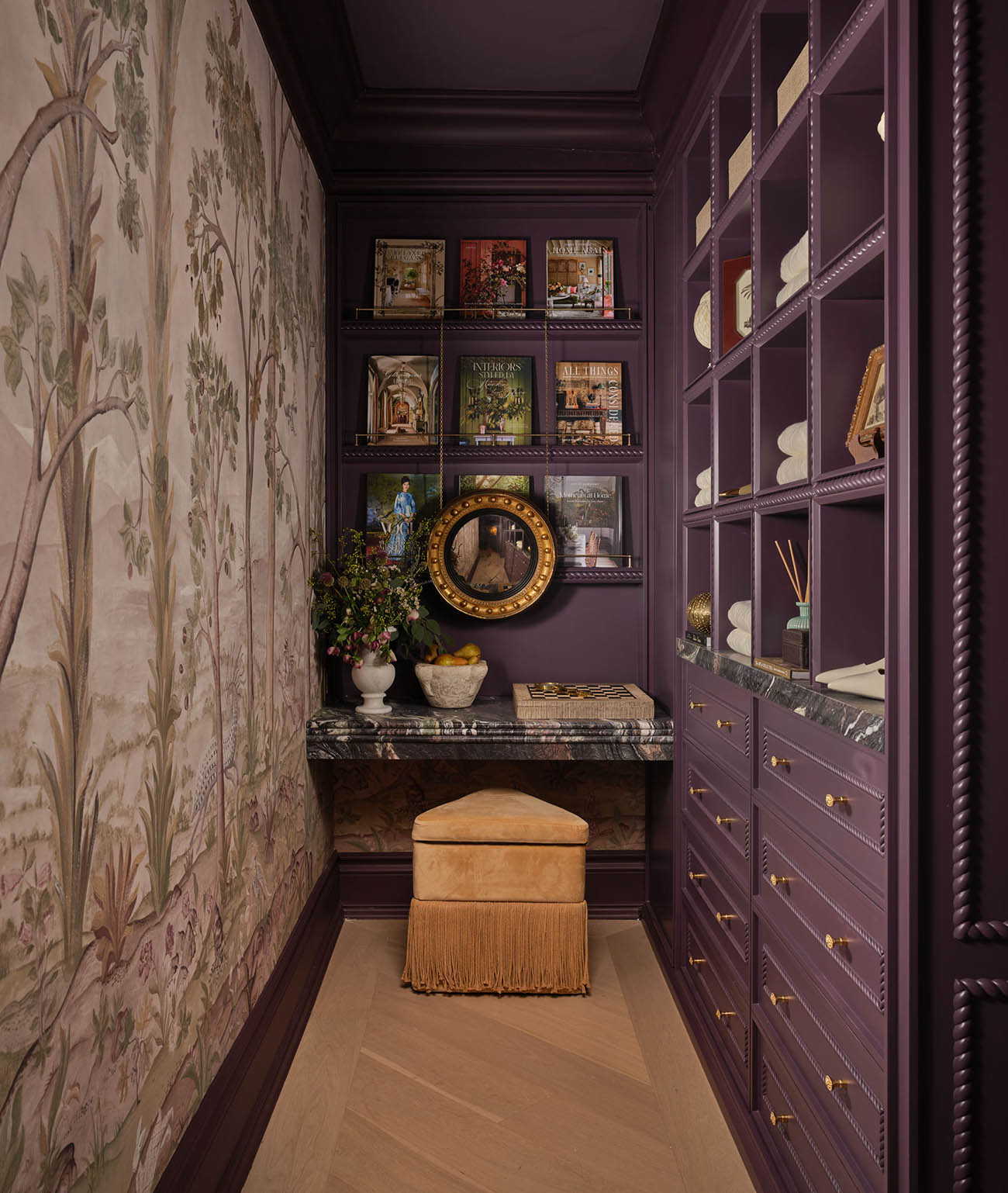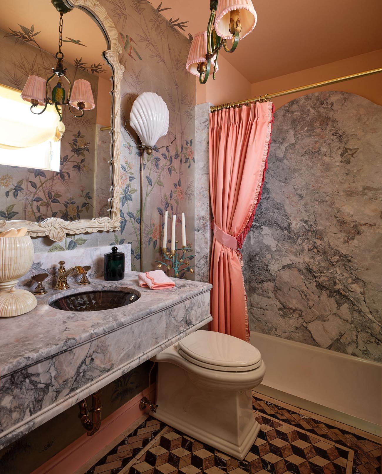 In the spirit of Marjorie Merriweather Post—businesswoman, socialite, philanthropist, and consummate hostess—the entertainment center just off the kitchen was designed for party planning, where guest lists get created, thank you notes written, and barware and linens stored. The nook of an office took advantage of an existing closet. The inset was deep enough to house an antique bamboo desk, chair, and shelving, artfully framed by drapery from Pierre Frey. Opposite, a pagoda-style armoire—outfitted with a Mirror TV by Reflectel and finished with Samuel & Sons Sophie Tassel Tiebacks and French Double Welting in Hunter Green—functions as a bar with additional storage for partyware, with accessories from Made Goods, Pigeon & Poodle, and bar accessories by Blue Pheasant. And at the end of the hall, a brass picture rail from Tillys Interiors floats an antique bamboo mirror. The de Gournay pleated backdrop is an opulent gesture for an otherwise small space, a nod to curating unforgettable experiences and spaces, no matter the size. A pair of slipper chairs from Coley Home and the warm glow from a chandelier from Urban Electric overhead make for a sweet corner moment to sip and chat. Illuminating the hallway that connects the Entertainment Center to the Powder Room are custom Vietnamese silk lanterns. The walls are clad in Chinoiserie grass cloth wallpaper from Kravet, and tortoiseshell print wallpaper by Gracie on the ceiling completes the look. The powder room lifts from Merriweather Post’s décor throughout her homes, inspired by her extensive world travels. The custom tile and pattern on the floor by Artistic Tile and the shower curtain tassels are a nod to Moroccan patterns and embellishments. The floating sink as well as the shower surround are cherry blossom marble, also from Artistic Tile. The French gold finish of the fixtures by Kohler plays on the vintage mirror and sconce. The delicate climbing tendrils of the silver-ground wallpaper from Gracie showcase the transporting effect of wallpaper in small spaces.
