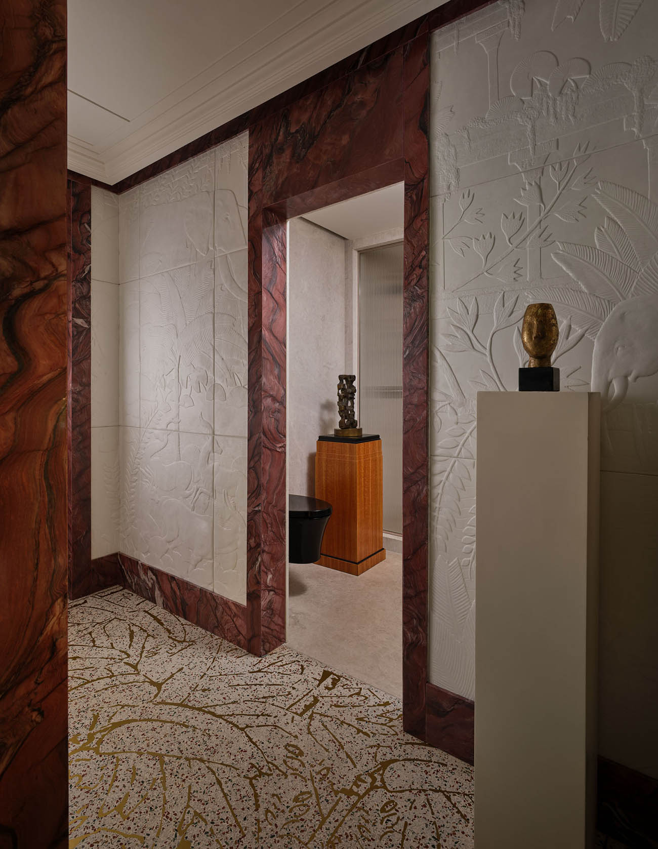 A restrained material palette elevates the interiors, pairing the expressive tactility of tropical relief panels with the enduring luxury of marble. Plaster-inspired wall sculptures, shaped by botanical forms, lend an immersive, atmospheric quality to the space, while marble surfaces introduce a sense of quiet richness and permanence. The result is an environment that feels both sensorial and sophisticated rooted in nature yet unmistakably modern.