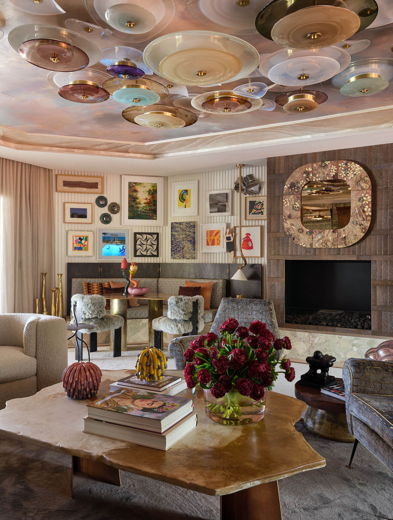 Unapologetic in vision and global in sensibility, the Great Room unfolds as Deborah Wecselman’s curated journey through intimate moments shaped by three decades as an interior designer, a collector at heart and traveler by instinct. Echoes of Paris emerge throughout the space, shaped by years spent sourcing at the city’s underground flea markets, where Wecselman acquires her antiques fresh from their original owners before entering the restoration process. This sense of wanderlust is woven throughout the room, expressed in an eclectic interplay of pattern, texture, light, and form. At once personal and cosmopolitan, the space is evocative of Deborah’s own thoughtfully curated living room, defined by her seasoned fluency with collecting art and design. One immediately gets a glimpse of her first New York City apartment in the 1980s through antique mirrored panels, framed in custom brass metalwork. The reflective surfaces create a dynamic nature against the soft plaster walls, finished in Benjamin Moore’s Swiss Coffee OC-45, chosen for its nuanced warmth and matte depth. Hanging in the center is a piece by Colombian textile artist, Olga de Amaral, a nod of Deborah’s South American background now elevated by the acclaimed artist whose work was featured at the Fondation Cartier. A series of dividing panels continue within the focal wall. A custom sculptural sofa from Pivot Home with Samuel & Sons Leather Piping in Metallic Gold and Julienne Metallic Piping in Antique Gold, upholstered in textured Metaphores, Brunschwig and Fils, and Kravet fabrics invites one to sit in the main area complemented by a set of vintage lounge chairs and an Owe Armchair by Christophe Delcourt via The Future Perfect. A one of a kind hand-polished marble and bronze Alex Turco Coffee Table from Artemest sits atop a custom area rug by Stark Carpet, binded with metallic leather by Studio Art, perfectly outlining the sofa’s silhouette. French oak flooring by Storia grounds the space with patterned angularity and warmth. Look up to see an iridescent hand-made blown glass ceiling installation by Jamie Harris for Todd Merrill Studio with Calico’s Atmosphere dusk wallpaper on the ceiling. The banquette area emerges as an intimate gathering point, set against fluted wall panels and anchored by an eclectic art composition from Deborah’s personal collection; an unmistakable nod to her time at Ralph Lauren, recalling the brand’s mastery of lifestyle, with every layer chosen for a reason. Upholstered in Nobilis’ Shima with shimmer cord, the banquette’s cushions by Le Jeune are framed by a birds-eye maple veneer screen by HASAC Millwork with refined hardware details by Nanz. The composition is grounded by a honed Ceppo Bi Sicilia stone base by ARCA, which continues seamlessly into the fireplace surround. Layered pillows from Pierre Frey’s newest collection soften the composition and invite interaction. The Bossa dining table is a solid cast bronze and is paired with chairs from Ralph Pucci, reupholstered in custom Peruvian fabric in “mint ice fur.” Overhead, a bronze Anna Karlin Sketch Pendant draws the eye downward, completing the vignette. The fireplace is an extension of the room’s social rhythm, clad in ceramic tiles from Artistic Tile. An EcoSmart Fire fireplace completes the composition. The Neotropic Mirror by LGS Studio via The Future Perfect crowns the area with its ceramic texture. Just beyond, the Visionnaire Siona Bar introduces a refined hospitality note, finished in high-gloss blue lacquer. This final stop invites you to play board games at a Todd Merril table, featuring a vintage lucite chess board, alongside late-night drinks and informal gatherings, with ottomans in different shapes upholstered in Metaphores fabric and a french oak Redux bench from Slash Objects extends the room’s sense of conviviality. At its core, the room reflects a cosmopolitan approach to living, deeply layered and rich with textural dialogue. The result is a space that feels lived-in, where a multitude of materials—metals, mirrors, stones, and woods—are composed with confidence. “I love the idea that many lives can exist in one room at the same time—talking, gathering, and socializing,” says Wecselman. It encapsulates her belief that great design is not created all at once, but thoughtfully accumulated over time.