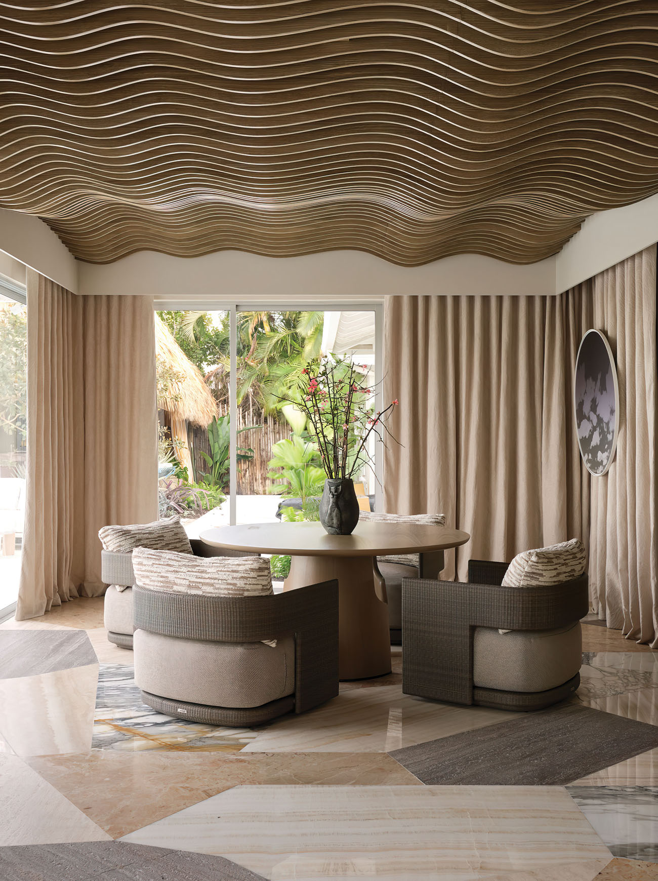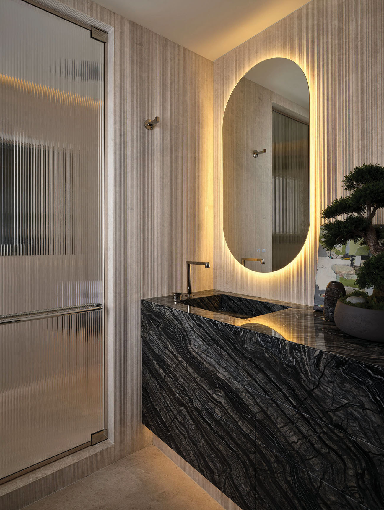 Materiality had a strong presence this year with an abundance of striking stone counters and floors throughout. The beautiful pink marble by Calia Stone in River Brook’s tiki bar adds convivial cool, while Sire Design’s feminine dressing suite is balanced out by a dramatic black Primestones countertop. Firefinish leaned into a modern geometric pattern from Artistic Tile to adorn the floor and walls, creating a joyful sanctuary. Finally, Steven Walsh leaned into plaster and black marble from ARCA setting up a sophisticated, sensory bath experience.