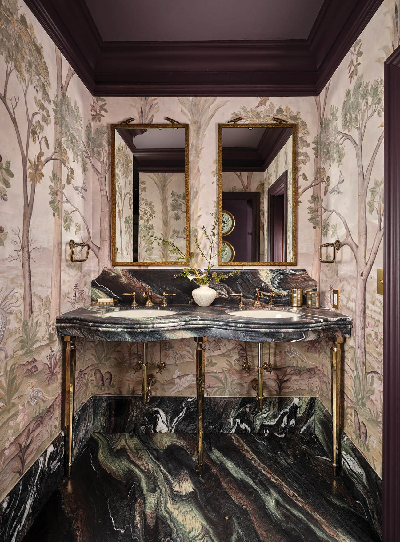 The power of wallcoverings to transform a space and transport inhabitants to new worlds were on full display. Lisa Erdmann’s Mustique-inspired sitting room brings the outdoors in, ushering island flair with Brunschwig & Fils’ Nouvelle paper. A classic floral Colefax & Fowler wallcovering in Justin P. Moreland’s entry offers a delightful layered element with a delicate embroidery that pairs swimmingly with the painted trim and ceiling. Lori Morris goes all-in on gilded glamour with a pastoral scene by Paul Montgomery’s The Mural Source.