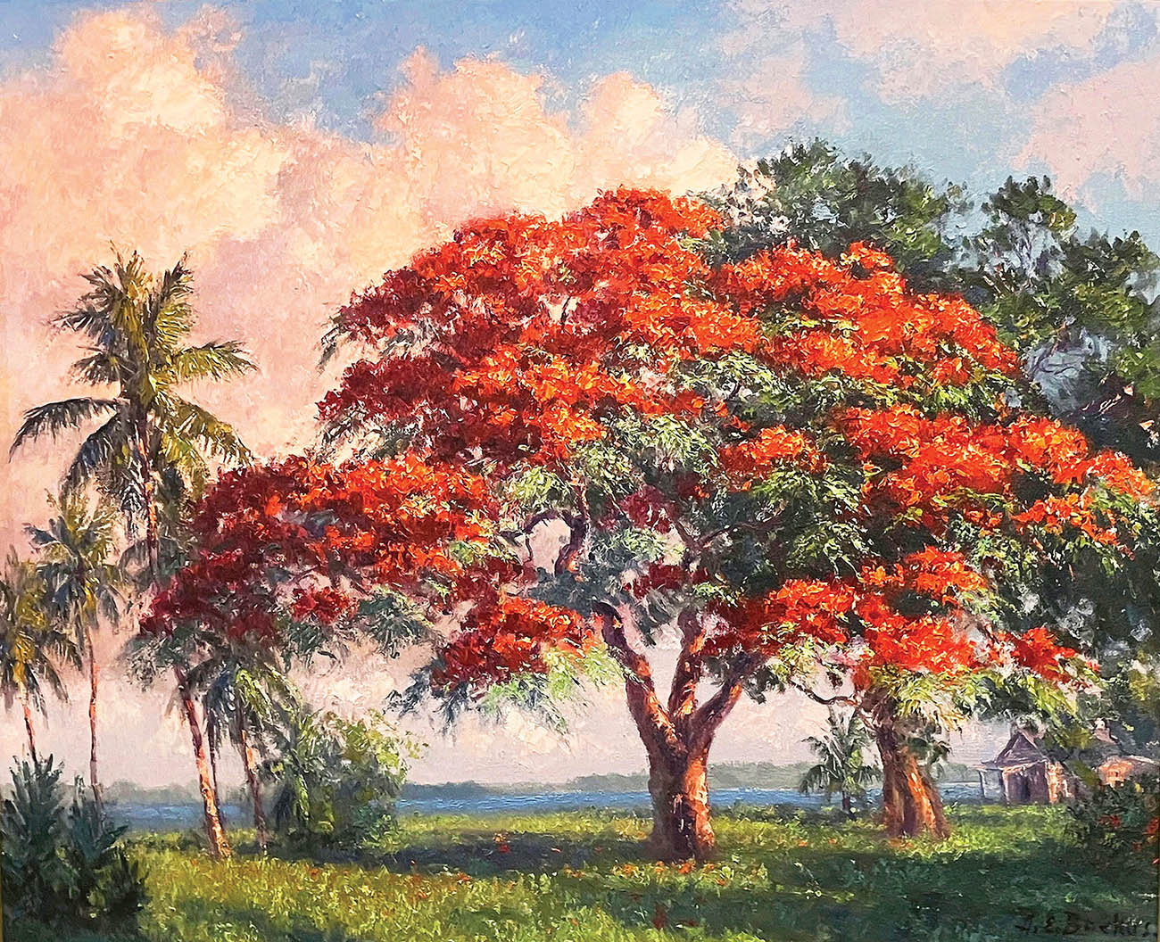 A. E. “Beanie” Backus (American, 1906–1990), Royal Poinciana on the Indian River, Florida, circa 1960, signed, oil on canvas, 20 x 24 inches.