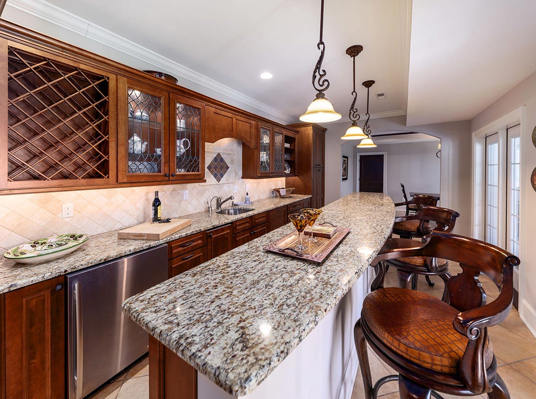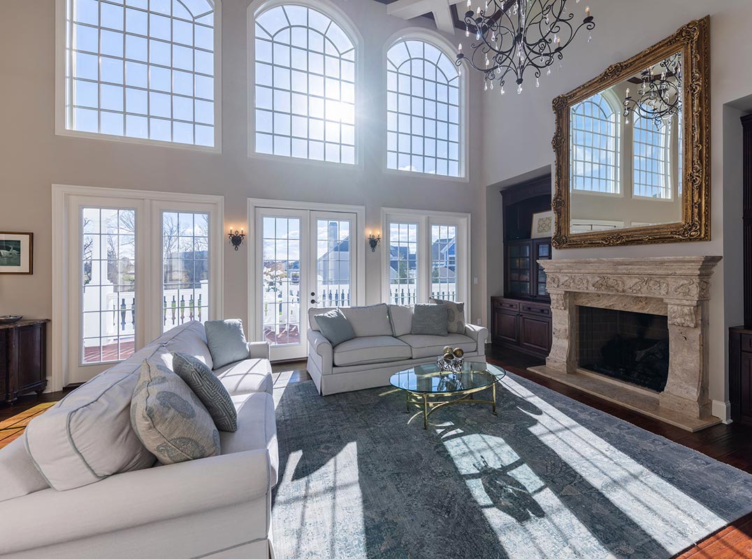 Impressive entry doors with a sweeping arch atop are layered with iron and glass, setting the stage for what is to come inside. With interiors reminiscent of an Italian villa, a generous, two-story foyer is embellished with a deep coffered ceiling that is artfully crafted on a diagonal and is repeated in the pattern on the stone floor tile below. Arrival is celebrated in the piazza-styled entry foyer wrapped by a dramatic winding-stair; .and sided by a formal study clad in rich wood paneling, library built-ins, and a gas fireplace. With light streaming from a Palladian window, the extended foyer is flanked by a formal hall punctuated with engaged columns, mini-coffers and chandeliers that unfold as a foreshadow to the inspiring two-story great room beyond. Bathed in the light from a wall of stacked windows and atrium doors that frame panoramic views of the Lingo Creek and the Jack Nicklaus Signature golf course grounds, the great room boasts paired chandeliers and diagonal coffering on axis with a generous cast stone fireplace on one side, and a pair of strong architectural columns and arched opening inviting family and friends into an experiential, Italian cook’s kitchen like none other. A dramatic barrel-vaulted brick ceiling presides over an expansive contrast entertainer’s island, secondary-island, and professional appliances, luxuriantly finished in cabinetry panels and stainless steel. Spaces that radiate about the gourmet kitchen at the heart of the home include a waterside breakfast room with a stone fireplace and wood plank ceiling, a banquet-sized dining room with Venetian plaster over raised-rail and stile wainscoting, and a fully outfitted butler’s service pantry.