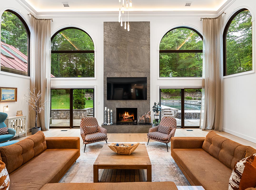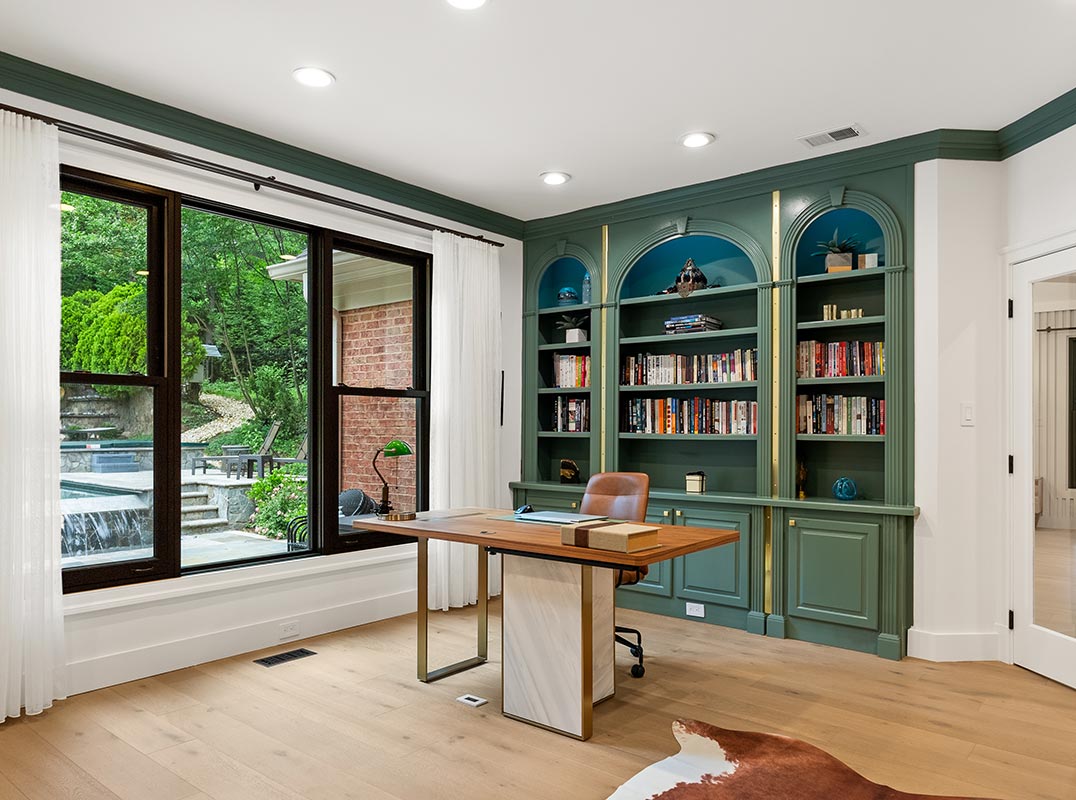 Nearby, the newly added screened-in porch with skylights, integrated firepit, and roll-down shutters creates a year-round retreat. The formal living room anchored by a second fireplace and the private library, enclosed with custom glass partitions, also overlook the resort-style pool for a tranquil yet inspiring work-from-home setting. Just beyond, the main level primary suite is a sanctuary unto itself, featuring soaring ceilings, couture-inspired, dual dressing rooms with custom floor to ceilings built-ins and lighting, and an expansive, spa-quality bathroom with Porcelanosa vanities. Dramatic windows overlook the pool and gardens bringing the serene landscape indoors to this suite.