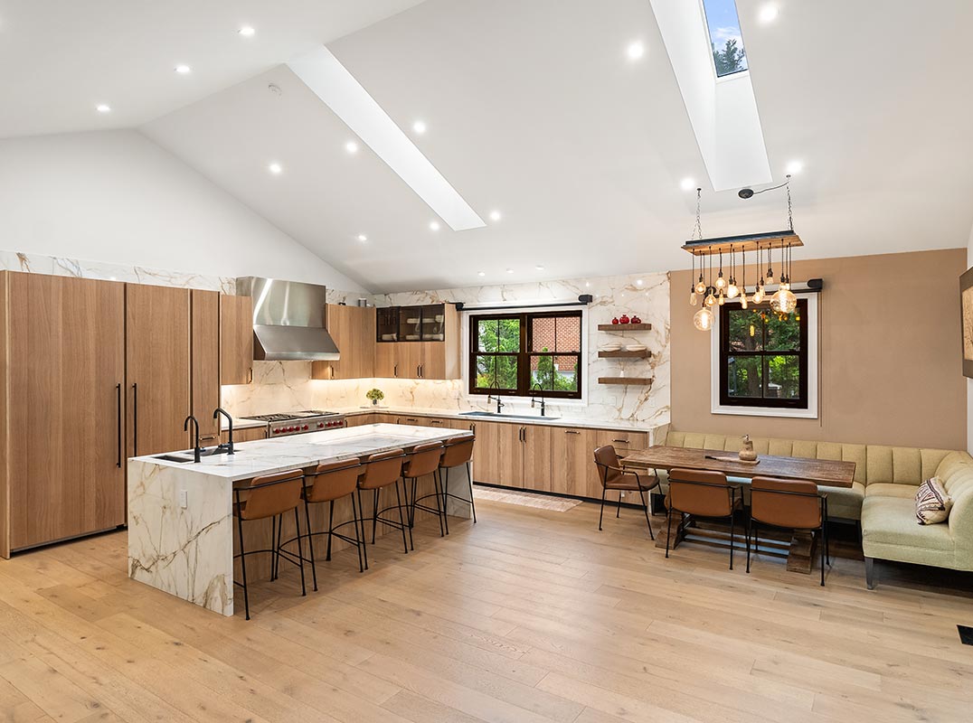 Upstairs, three additional bedrooms suites are thoughtfully appointed with cathedral ceilings, designer accent walls and en-suite skylit baths featuring operable Velux windows. A luxurious guest suite offers the flexibility of a second primary with a large closet and a generous en-suite bath. Downstairs, more luxurious surprises await. The walk-out lower level is flooded with natural light from large windows with views across the front gardens. The extensive renovation included the addition of a fully equipped in-law apartment suite with a separate entrance, its own kitchen and expansive living area as well as a large ensuite bathroom. Just beyond, a professional-grade gym, recreation, and game rooms yields expansive space for entertaining all ages.
