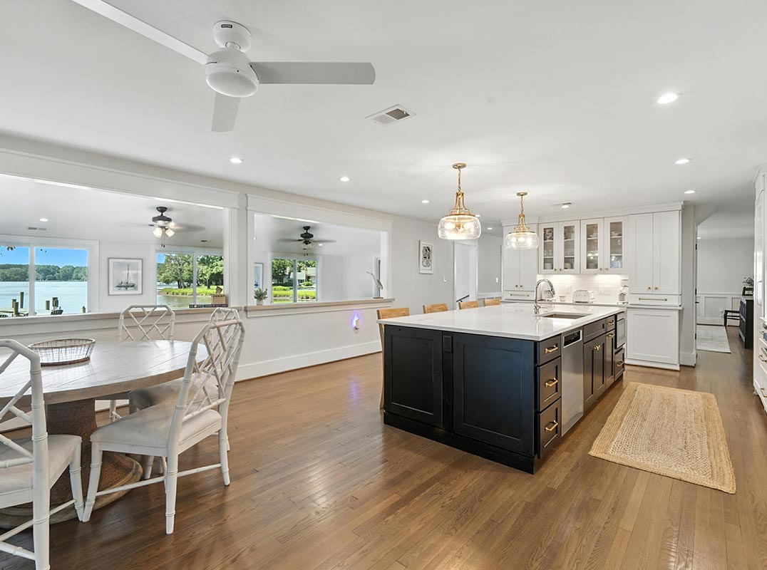The main level welcomes with expansive water views and features a guest bedroom with ensuite bath, a cozy family room (or den/office), and a gracious living room anchored by a large brick hearth and woodburning fireplace. The gourmet kitchen is the center of the home - outfitted with upgraded appliances, a center island with breakfast bar, and additional dining space. Adjacent is a second kitchen - ideal for effortless indoor/outdoor entertaining. A formal dining room and large waterside sunroom complete the main living spaces. Upstairs, two spacious primary suites anchor each end of the home, offering privacy and comfort, with two additional guest bedrooms (one with ensuite bath) and a hall bath in between.