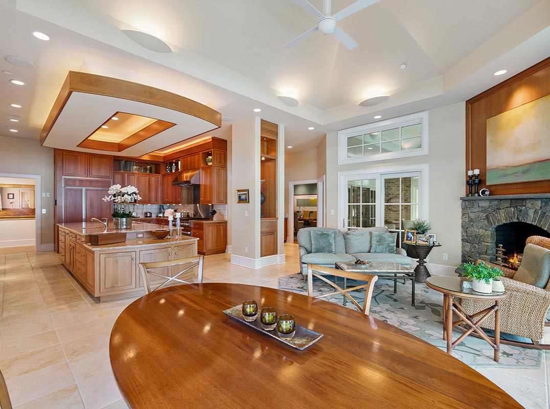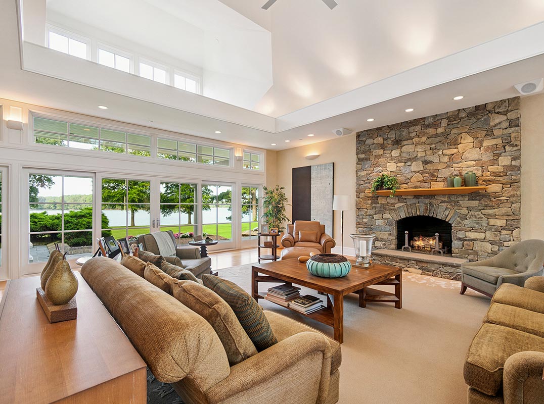The custom brick exterior is crowned by a new cedar shake roof with copper caps and bands, creating a refined profile that blends seamlessly into the natural surroundings. Double mahogany doors with full-view, artistically designed leaded glass open to a luminous foyer with immediate, breathtaking views of the water.