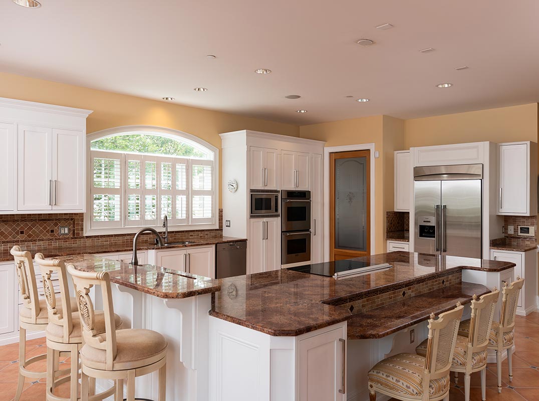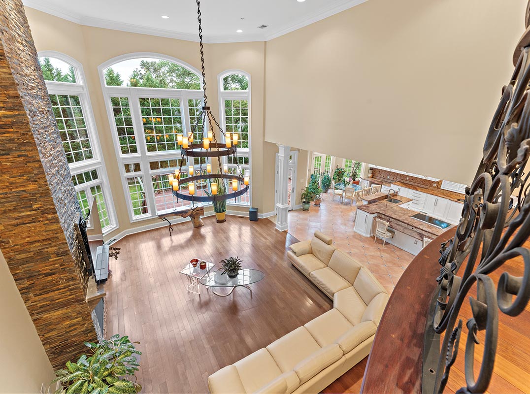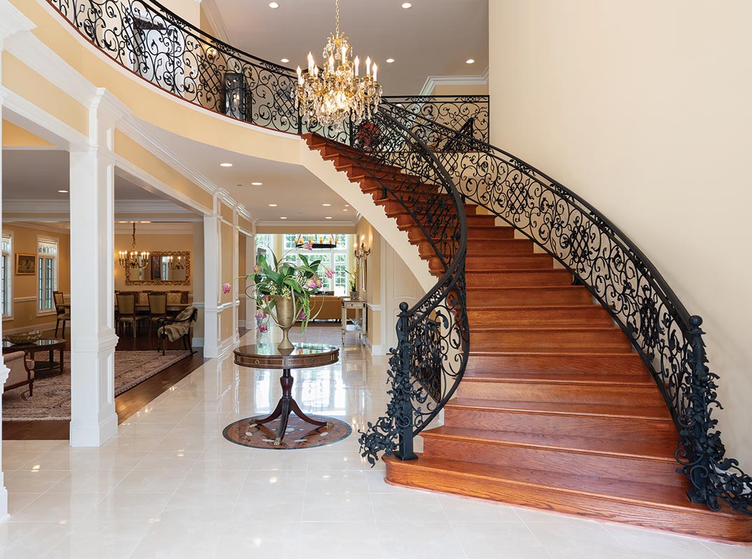 The estate welcomes with a herringbone brick driveway, elegant stucco façade, grand arched windows, and intricate wrought-iron balconies. Inside, expansive yet inviting spaces cater to both intimate gatherings and lavish entertaining. The grand foyer, adorned with bespoke Italian tile, showcases a custom wrought-iron staircase with delicate vine and blossom designs, setting a tone of refined elegance. The main level unfolds with a formal dining room, tranquil living room, distinguished home office with French doors, and a versatile morning room. The heart of the home, a state-of-the-art kitchen, boasts premium appliances, handcrafted cabinetry, an auxiliary catering kitchen, and a charming breakfast nook that flows into a soaring family room.