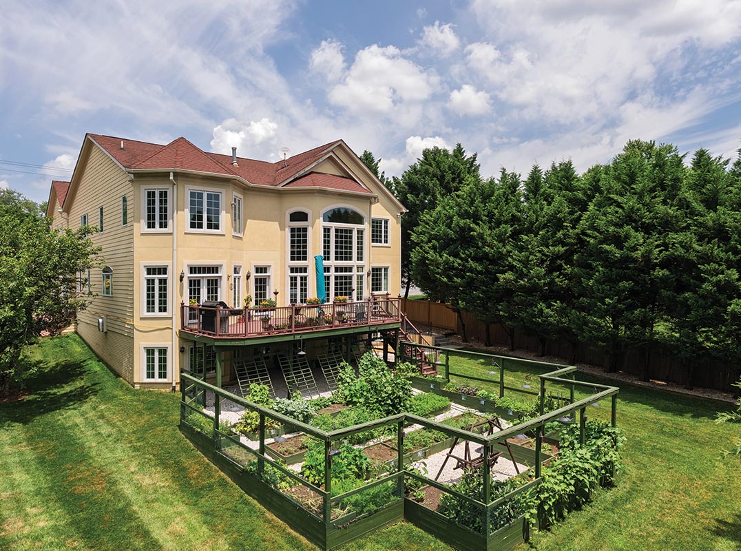 Here, a two-story stone fireplace exudes warmth, while the sunlit conservatory windows offer sweeping views of the lush grounds. A spacious deck extends from the kitchen and family room, perfect for al fresco dining or quiet evenings overlooking the vibrant landscape. Outside, the meticulously curated backyard is a masterpiece worthy of a luxury home and garden magazine cover. The showstopping herb and vegetable garden, framed by elegant stone pathways, thrives with a sophisticated drainage system ensuring year-round vitality. Ambient barn-style lighting casts a warm glow, transforming the garden into an enchanting evening retreat. Exquisitely landscaped grounds envelop the estate in tranquility, offering a seamless blend of nature and refinement.