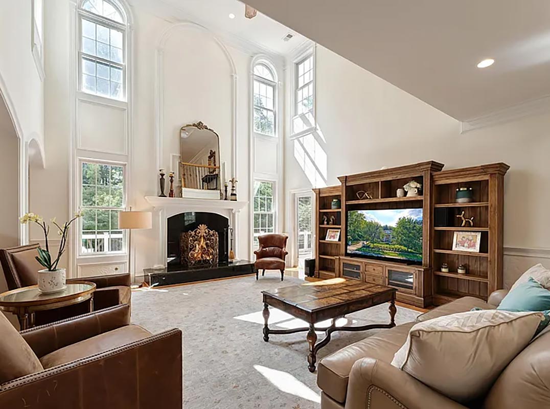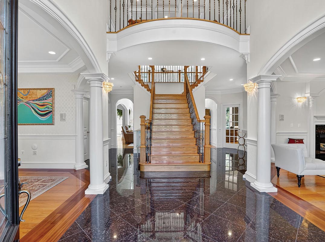 Main Level: Step into a stunning two-story granite foyer with chandeliers, pendant lighting, wrought-iron railings, and sweeping arches that lead you to the formal and informal living spaces. A chef’s gourmet kitchen is the centerpiece, featuring granite counters, stainless steel appliances, and a large island that flows seamlessly into the dramatic two-story family room. A light-filled sunroom overlooks the expansive backyard and opens to a wraparound deck, perfect for al fresco dining. The formal living room shares a double-sided fireplace with the richly appointed library, creating a warm yet refined atmosphere. Hardwood floors run throughout, tying together each space with elegance.