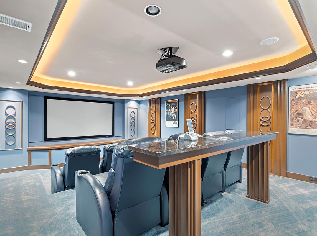 Amenities Galore: Finished four-car garage; professionally designed multi-level theater, full dance floor, designer decor, and impeccable, move-in ready condition with over $500k in builder upgrades. The entire roof was recently replaced, and electric shades throughout the home will convey.