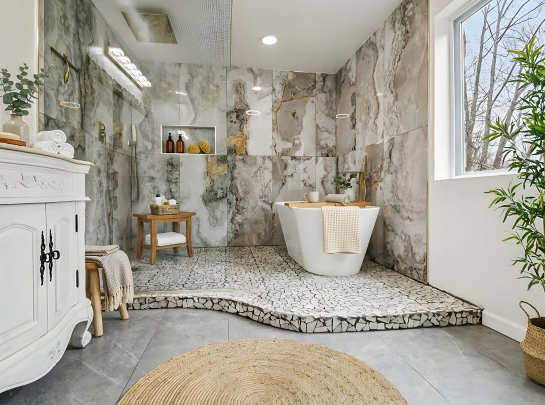The top floor is home to a second luxurious primary ensuite with the third of four fireplaces, and offers a balcony with stairs down to the terrace pool. Advancing down the hall, there are three more bedrooms, one of which is the third ensuite within this residence. Finishing this level, you will find the first of two laundry rooms.