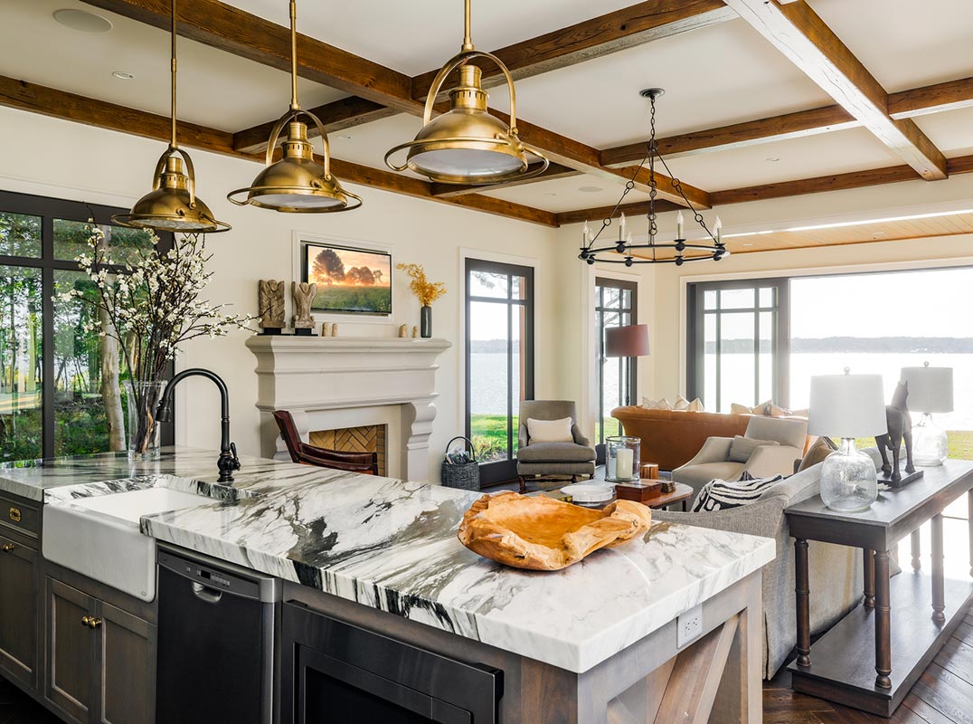 Open-concept interiors are found behind the dutifully recreated 1920s façade. The large main living area is surrounded by three walls of glass, one of which fully opens to blur the lines between indoor and outdoor living. Distressed ceiling beams overhead beautifully complement rift-cut and quartered herringbone white oak floors throughout. The kitchen is again a showcase of refined design blended with functionality. Bold, thick-edge Black Calacatta marble is generously applied in large slabs over the expansive center island and backsplash. It pairs with cerused oak cabinetry, a sculptural custom hood, and warm brass fixtures and hardware.
