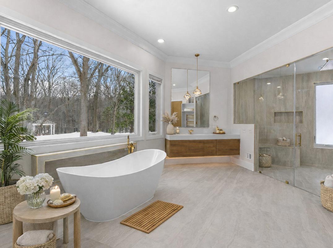 At day’s end, retreat to the distinguished main-level primary suite, a private sanctuary designed for comfort and refinement. Complete with its own sitting room and fireplace, the suite offers warmth and architectural presence. Newly installed picture windows in both the bedroom and the completely redesigned primary bath invite natural light while framing serene views. Dual closets, soaring ceilings, generous proportions, and exceptional privacy define this elevated haven, where tailored finishes and a calm, modern aesthetic create a true sense of escape. Adjacent is a bonus room that could be for a nursery, a gym, an additional closet, or even another bedroom.