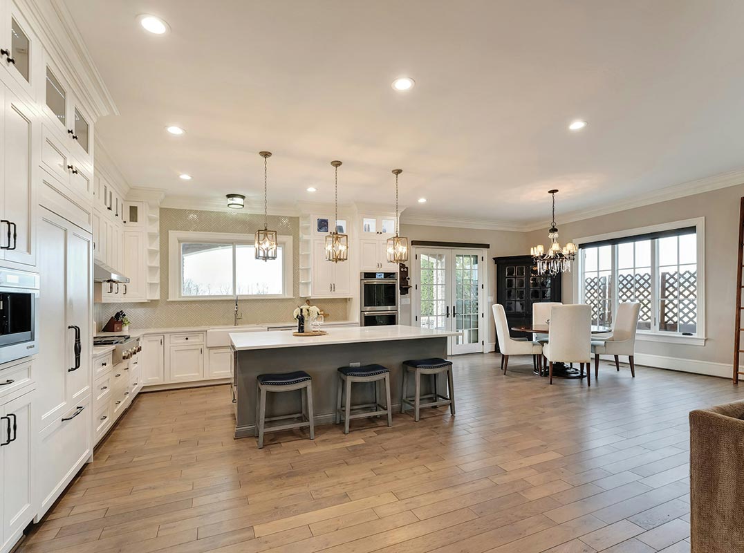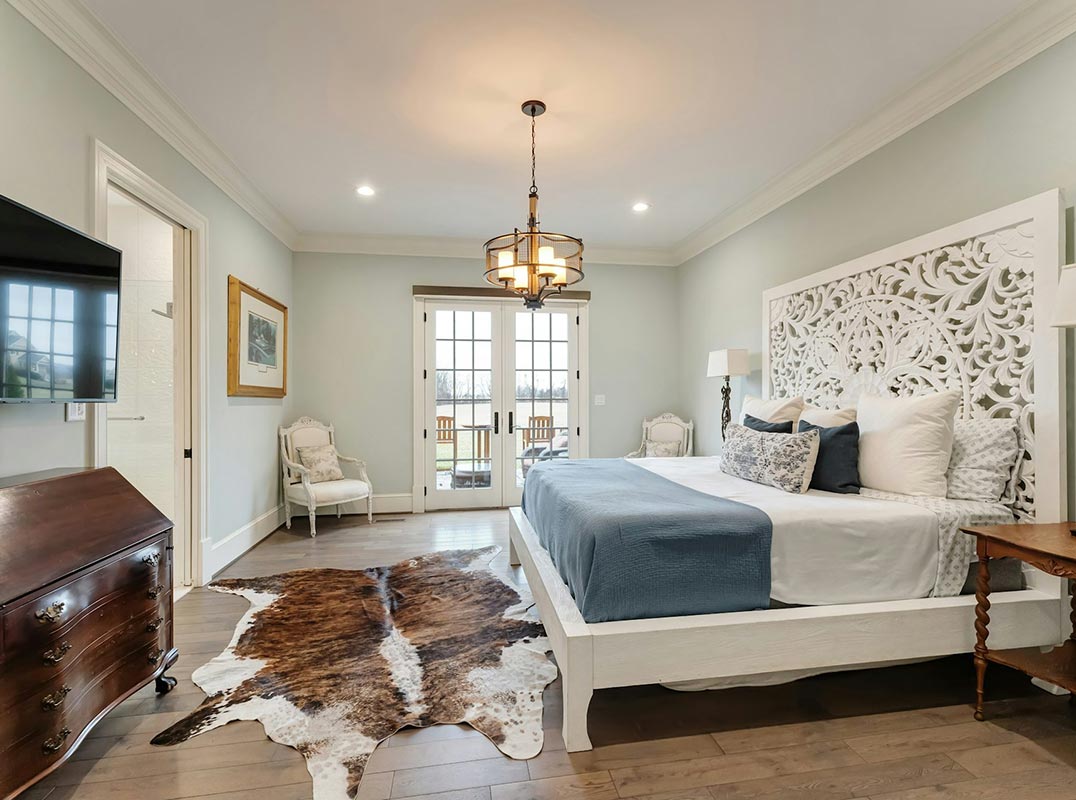 In the airy chef’s kitchen, professional-grade appliances pair beautifully with cloud-hued cabinetry, stone countertops, and a nostalgic farmhouse sink. From the island, add the finishing touches to meals as guests select a bottle of local vino from the wine refrigerator.